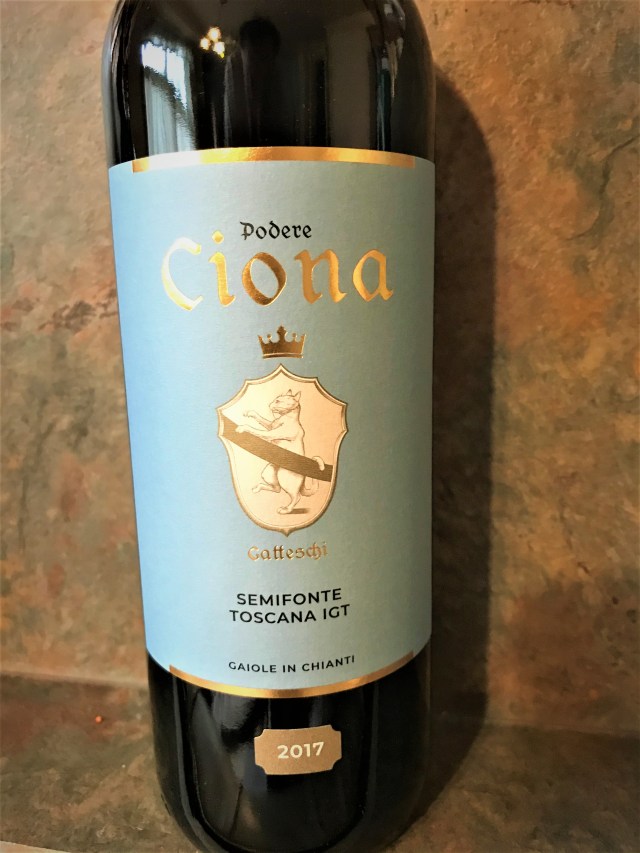 The Podere Ciona Semifonte Gaiole in Chianti IGT 2017 and is termed a Tuscan Rosso wine. Toscana IGT is the most famous of the IGT designations and it actually has three sub-regions already, and there are ten provinces that are allowed this designation. Tuscany is the home of Italy’s most famous IGT category, but it was where this category forced the hands of wine classification for a new designation, because some of the wine makers felt constrained by the current rules, and originally had to use the lowly Vino de Tavola or Table Wine designation for their new wines. Finally, in 1984, Sassicaia was granted its very own title of DOC Bolgheri Sassicaia and the floodgates were opened. IGT is Italy’s version of the Common Market’s designation of IGP. This particular wine is eighty-five percent Merlot and fifteen percent Alicante Bouschet, the same varietal that they add to their Chianti Classico. This is a high-altitude Merlot planted on a mix of quartz and clay of vines that average about fifteen years of age. The wine has been aged for twelve months in French Oak and then cellared for eight months in the bottle, before being released. There were about five-hundred cases produced and according to The Fine Wine Source they have the lion’s share of the production. The wine is described as being a bright purple-red with aromas of plums, herbs offering layers of flavors with spices in the finish. Since, I always mention how much I enjoy Merlot, I guess this will be a no-brainer for me.