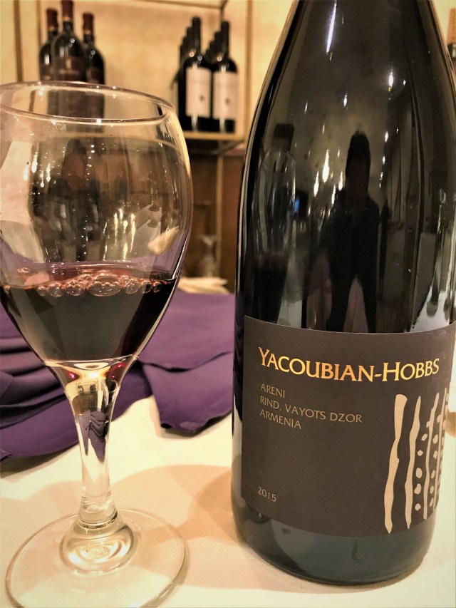 Now, I bring all of this up, because I recently was approached by the winery, if I would try their wine a second time.  Several months ago, I went to a special wine tasting event at one of the Armenian churches in the Detroit area and had a chance to try many different Armenian wines along with some great Armenian food, and the event was a fund raiser.  I did not give the wine a glowing review, much to my sadness, but I feel that I must be true, in what I write.  I went back and copied what I wrote, to save you the effort “The other wine that I will discuss is the Yacoubian Hobbs Areni Noir Vayots Dzor 2015 that I had actually read about and was glad to see its presence and I was looking forward to trying it.  Paul Hobbs of California has been partnered with at least two wineries outside of the United States and here with the Yacoubian family.  The partnership began in 2008 and a new vineyard was planted in 2014 near the Areni – 1 Cave, the site of the world’s first commercial winery.  The Areni Noir grape is ancient in Armenia, but a fresh newcomer to the international wine community; it is a dark, thick skin grape that is perfectly adapted to the major temperature swings in the high elevation plateau where the grapes grow best.  This wine is also from the Vayots Dzor region.  The wine was fermented and aged in Stainless Steel and eleven-hundred cases were produced.  As I stood in line to get a taste of the wine, the couple in front of me, took one sip, poured the balance of the wine into the spittoon, and immediately rinsed the glass with water, looked at me, and told me not to bother, but I had to try it.  They were absolutely right, I could find no redeeming qualities to the wine, and I really would prefer not to say that.  The entire wine was off, the nose was non-existent and the wine had nothing worth noting, I could not even find any words to describe what I was tasting.”  After all of the wines and reviews I did mention that I felt that the tasting event was not well handled, the wines may have been rushed in, and in perhaps not the best manner.  I also mentioned that a lot of the vineyards were young, and there is something to be said about old vines, or so many labels would not mention that fact.  I also said that I would not let that one night deter me from trying more wines from Armenia.