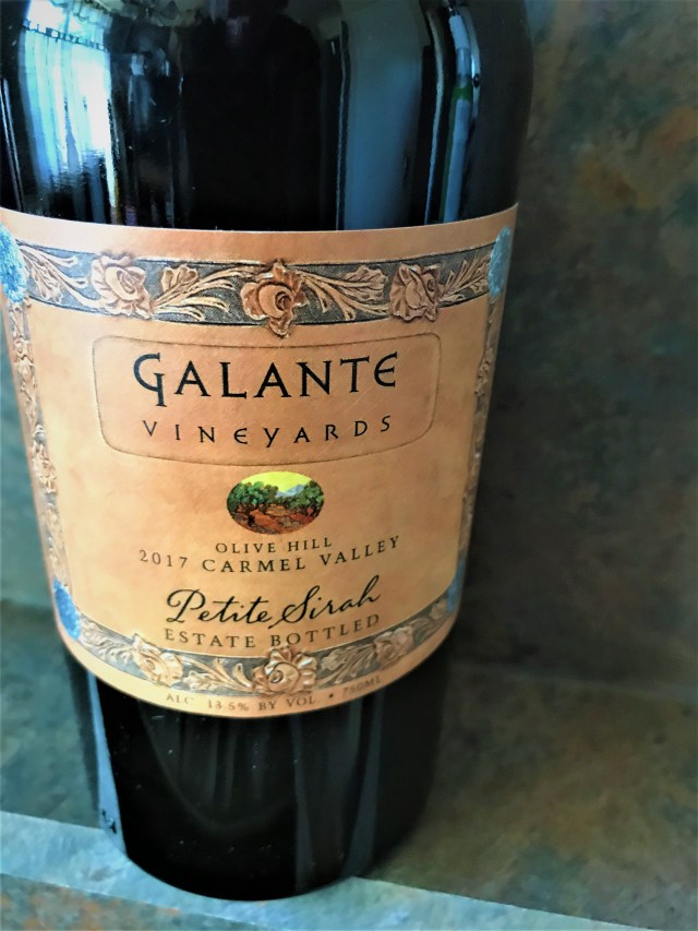The first bottle I pulled out of the carton was selected because it was a short and squat bottle as opposed to the classic European style bottles that one normally associates with wine. It was a bottle of Galante Vineyards Petite Sirah Olive Hill Carmel Valley Estate Bottled 2017. The Galante family has a long personal history in the Monterey County of California. Jack Galante’s great grandfather, James Frank Devendorf, was the founder of Carmel-by-the-Sea in 1900, and later built the Pine Inn and the Highlands Inn (which we have enjoyed a couple of times). In 1969, Jack’s parents purchased a seven-hundred-acre cattle ranch in what was then rustic Carmel Valley. In 1983, the Galante family began growing premium wine grapes on the property, specializing in Cabernet Sauvignon. In 1994, Jack Galante built a winery and used his grapes to produce his estate bottled wines.