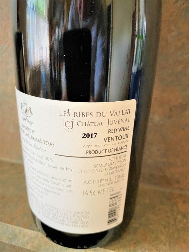 Chateau Juvenal “Les Ribes du Vallat” Ventoux 2017 is so named because the plots are distributed on the hillsides (the “ribes” in Provencal) which border the ditch (the “Vallat” in Provencal) which crosses the domain. In the spring, painters are known to set up their easels and paint different perspectives of the grounds, hence the artist and his easel on the label. Bernard and Anne-Marie Forestier teamed up with the Alban family, wine makers for three generations to build the wine cellar and to offer new wines. They have gone the organic route to create the wines. The wine is a blend of seventy percent Grenache and thirty percent Syrah from plots located at the foot of the hillside (ribes), on the edge of the ditch (vallat). The wine is described as having the fruity sweetness of the Grenache, and balanced with the minty, licorice and peppery notes of the Syrah. It is touted as the perfect wine for anything grilled or later for stews.
