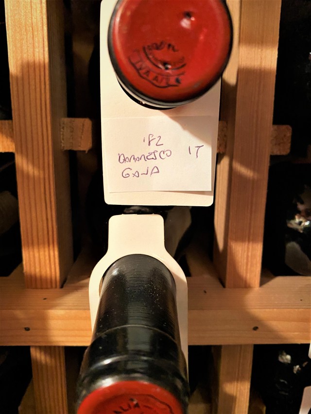 It was more work than I had anticipated, as I had to box up half of the wall to create a work zone and did column by column and I was working out of cases that I first sorted by varietal, and then started sorting by vintage, and thank God for sturdy empty cartons that I could put on the floor and then place another carton on top of, to make it easier on my back, as well as the different heights of the steps on the staircase going into the basement. I don’t know if it makes me appear to be smart or to be lazy or maybe a combination of both, but it was a work out, and so will all the other racks that I will do, in the future. I guess that I have a certain amount of pride, as I actually built the entire cellar room from scratch, as it was just an empty corner of the basement with poured concrete walls. If nothing else, I will work up a thirst.