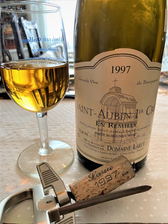 Now what to serve during the appetizers?  I thought that I would let them try an older white Burgundy, the stuff I have been writing about for awhile as I am reorganizing the wine cellar.  I had a bottle of Domaine Larue Saint-Aubin En Remilly Premier Cru 1997 and I can’t believe it slipped through the cracks.  The Larue family domain is forty-two acres, based in Saint-Aubin but extending into Chassagne-Montrachet, Puligny-Montrachet and Aloxe-Corton.  They actually offer nine different bottlings from Saint-Aubin.  Saint-Aubin is located in a valley that cuts through the Cote d’Or and En Remilly is just above the valley floor on the south-facing slope, directly across from the Chassagne-Montrachet Premier Cru vineyards.  The wines of Saint-Aubin are made from Chardonnay, but are noted for their floral and mineral notes.  Alas, this twenty-three-year-old had lost the floral nose and the mineral terroir finish and was drinkable, but with no sparkle or excitement.  The second wine during the appetizers was Cave de Genouilly Bourgogne Aligoté 2018, the almost forgotten white wine of Burgundy, but it has its own appellation.  The Cave Des Vignerons de Genouilly was founded in 1932 as a co-operative of family growers in the Cote Chalonnaise region of Southern Burgundy.  Today it includes ninety growers with one-hundred-eighty acres based around Genouilly, Fley, Bissy-sur-Fley, Saint-Martin-du-Tatre and Saint-Clement-sur-Guye.  Bourgogne Aligoté is an appellation in Burgundy for white wines made from the Aligoté grape and the appellation was awarded in 1937.  The grape has been in Burgundy since the 17th Century, but only represent about six percent of the vineyards there, but is grown in about three hundred parishes in Burgundy, basically for the vignerons themselves.  The wines are generally made in Stainless Steel to allow the freshness and the crispness of the grape, if anything, some people are surprised at the high acidity and the resulting tartness that can occur, but that is part of the charm that I just recently discovered about this grape.  This charming wine saved the early part of the meal, as it is just a wonderful drinking wine and very refreshing.  If you can find this grape, by all means it is worth the purchase price and it is not that dear, because no one knows about it.