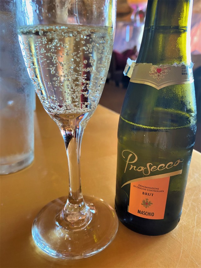 While I was looking at the wine list, I saw a wine that we were going to have the day before with lunch, but the restaurant was out, so we had it with lunch this time, just a little festive Prosecco on a very warm day, though in the grotto, it was very comfortable. We each had splits of Cantine Maschio Prosecco DOC Brut NV. In 1973 Bonaventura Maschio turned his family’s century-old distillery into a winery and it was even then considered a state-of-the-art winery in terms of technology and production and they actually produce the two biggest-selling wines in Italy, Maschio Chardonnay and Maschio Pinot Rosa. The wines produced by Cantine Maschio have their fruit grown from the hills of Valdobbiadene and Conegliano and in the Piave Valley. As this wine carries the Prosecco DOC, all production is by the books and it has to be at least eighty-five percent Prosecco (Glera) to get licensed and sealed with a banderole. It was just a very easy drinking wine and we ended up having seconds before venturing out back in the sun and the crowds.