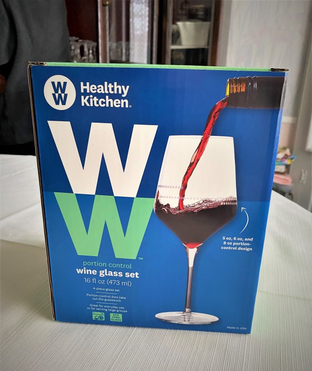 I didn’t think she was heavy, but once the gauntlet was laid down, she jumped on it with full support and she achieved better results than she had originally hoped for and she has maintained it. Since the challenge began, the world changed and people were stuck at home, and some people went on eating binges out of frustration and the gyms and spas were shut down. She persevered and changed some of her culinary techniques, learned new recipes, because we were home together all the time, though she continued to work, but now from home. Her clothes all had to be put away or given away, as she went down several sizes, and women’s sizing is still a mystery to me. Now you may be wondering what all this rambling is leading to, well as you may know, we happen to like wine in this household. Red wines and white wines and whether it is a three ounce pour or a five or six ounce pour have point values and if you want a glass of wine with dinner, you may have to forgo a dessert, to maintain the points. The 3K walks we do in the morning is also a leveraging device for the point counts. We took a commercial grade wine glass and made markings of three- and five-ounce pours, and periodically we would have to remark the glass, because repeated washings would start making the lines disappear. This is where the great idea comes into this narrative. Weight Watchers was selling these wine glasses that were much more elegant that had subtle ounce markings etched in the glass in a decorative motif, so that it didn’t look proletarian.