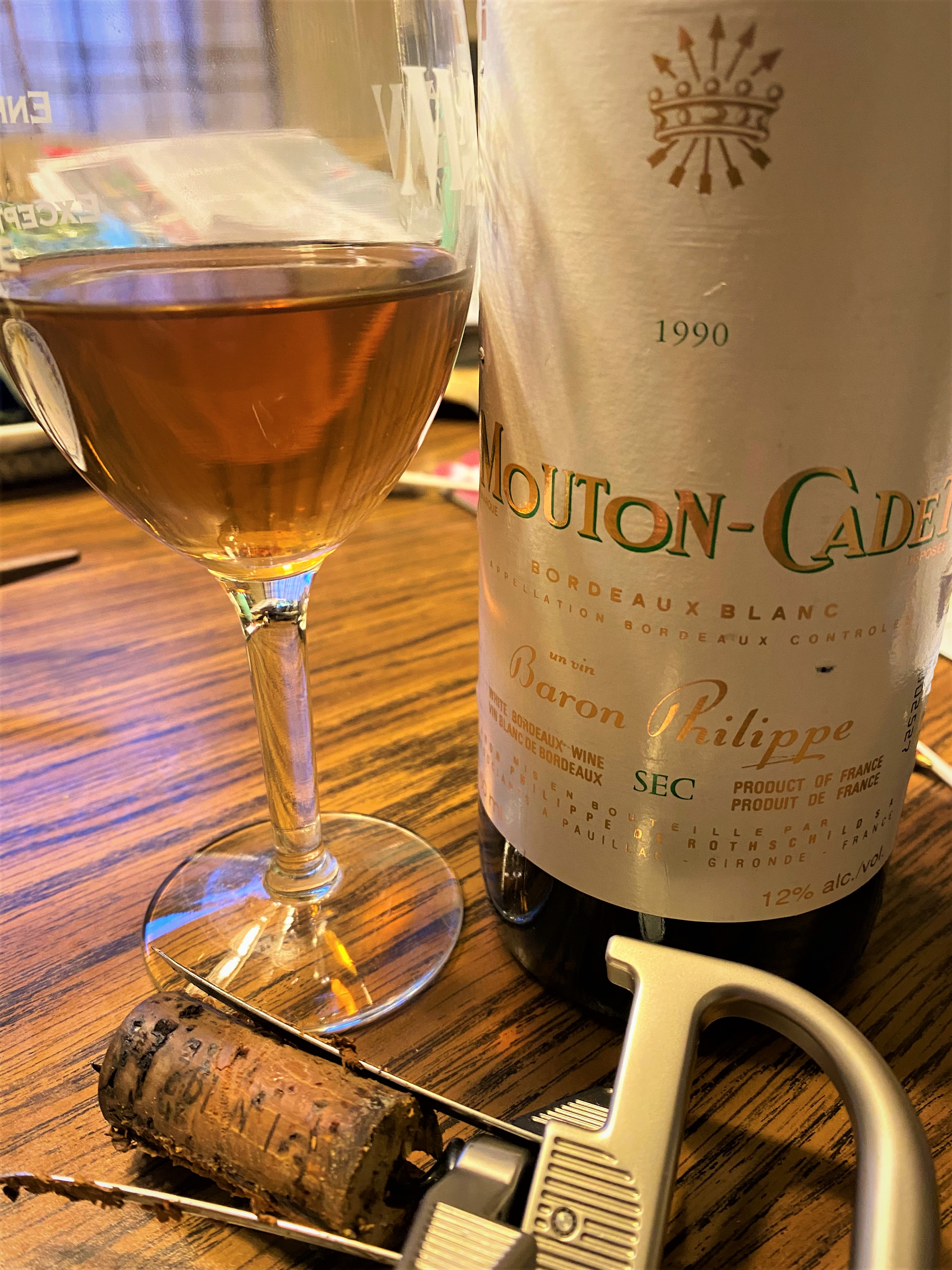 The second wine was one that I knew was just taking up space in the refrigerator and is the biggest selling Bordeaux wine in the world. Baron Philippe de Rothschild Mouton Cadet Bordeaux Blanc 1990, and evokes Philippe when he took over control of Mouton Rothschild as he was the youngest son, a cadet, and this new wine he started in 1930. It was originally a way to sell wine that did not meet the criteria of Mouton Rothschild and still a way to sell some wine. It proved so successful that he eventually began buying fruit from other vineyards in Pauillac, and a few years later from across Bordeaux. A white wine, Bordeaux Blanc, was introduced in the 1970’s and since 2004 the wine was structured to be more fruit forward with an eye towards the American Market. The wine is a blend of Semillon, Sauvignon Blanc and Muscadelle. I knew just by looking at the color of the wine in the bottle that this was a futile gesture on my part, but I proceeded. When I removed the foil cap, and started to insert the corkscrew into the cork, the cork actually started to slide into the bottle; by using my Durand, I carefully caught the worm of the screw into the cork and then used the Ah So two-part steel ribbons to extricate the cork which was ready to start crumbling. I poured some of the wine into a glass to take a photo and the nose alerted everyone in the room that this was not a wine to be even tasted and the glass and the bottle were both poured un-ceremonially down the drain. With a wine cellar, one has to take the good along with the bad at times.