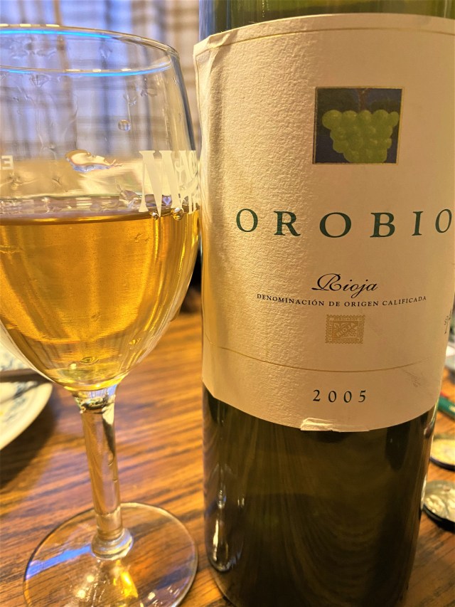 The first wine that I pulled out of the refrigerator, I gave myself maybe fifty/fifty odds that the wine would be good, but I wasn’t going to throw it away with out going through the motions. All wines are worth a chance. I had a bottle of wine that I did not recognize, which is not an indication of anything per se, but it was Bodegas y Vinedos Artadi Orobio Viura Rioja Blanc DOC 2005. Bodegas Artadi is a wine estate in the Alavesa region of Rioja and their single vineyard El Pison 2004 received a perfect score from Robert Parker, but this was not that wine. Bodegas Artadi began as a co-operative of thirteen growers in 1985. The vineyards and winery were purchased by Juan Carlos Lopez de Lacalle in 1992, and he also owns estates in Alicante and Navarra. This wine is pure Viura the local name in Rioja for Macabeo, a very versatile grape that is found on both sides of the Pyrenees and is very popular in Spain and southern France. This grape is known for being quite impervious to oxidation, but from most reports that I have read it seems ten years is the life span and this wine was fifteen years old. Alas, it did not make it.