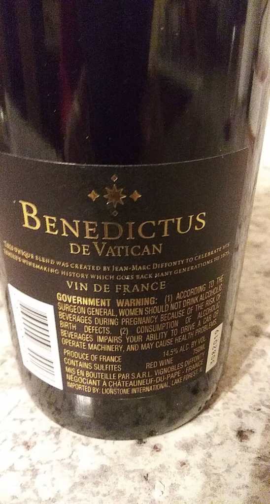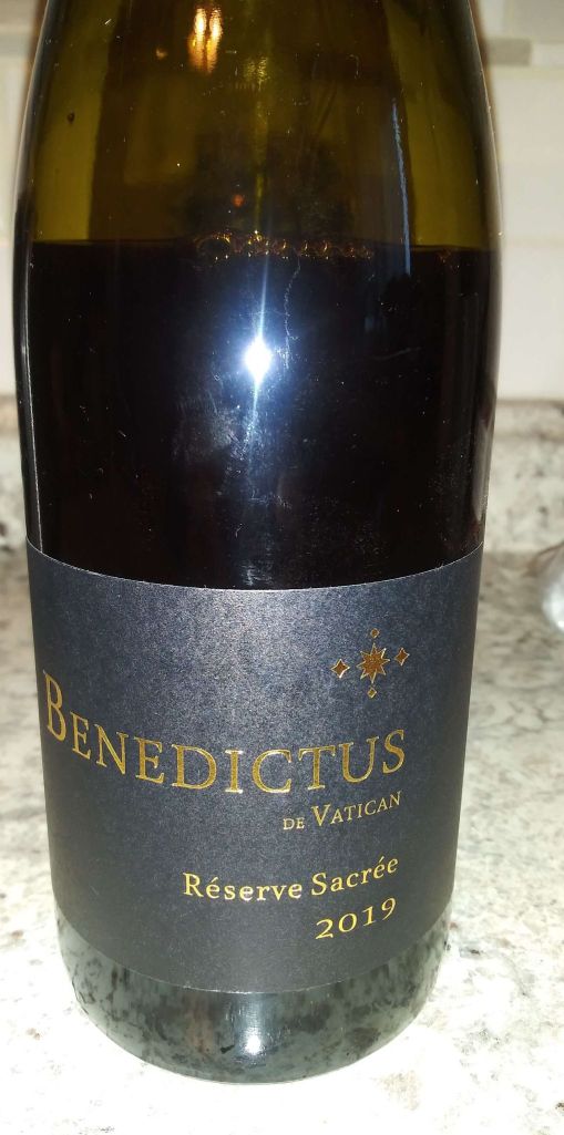 The Diffonty estate also makes Benedictus de Vatican Reserve Sacree 2019. As to be expected this wine is a blend of Grenache, Syrah and Mourvedre, the famed trio of the Rhone, but this wine is a blend of his finest Cotes du Rhone cuvee and his well regarded Chateauneuf-du-Pape wines for a big bang in value, and the wine is made in a limited production. Because this wine is a blend from two distinct appellations, it has to be listed under the basic tier of Vin de France, which was originally called Vin de Table or Table Wine. With increasing competition both from the European markets and the rest of the world, the Vin de Table appellation was losing ground, and areas and districts strove to increase quality and worked towards additional appellations and finally for wines that were considered better than table wines, because of rules that affected their status like this particular wine, the Vin de France appellation was created. I have seen reviews for this wine that say that one can expect black fruits, spices and tobacco notes along with the velvety finish of Chateauneuf-du-Pape. My friend told me, that she prefers sweeter wines, but told me that this wine wasn’t too bad. And before I leave this interesting wine, I will mention one of my favorite peccadillos about this region and I have mentioned it before, that the village of Chateauneuf-du-Pape has a famous municipal decree that bans flying saucers from taking off, landing or flying over the vineyards; and to my knowledge they have been successful with this law for the last seventy years or so.
