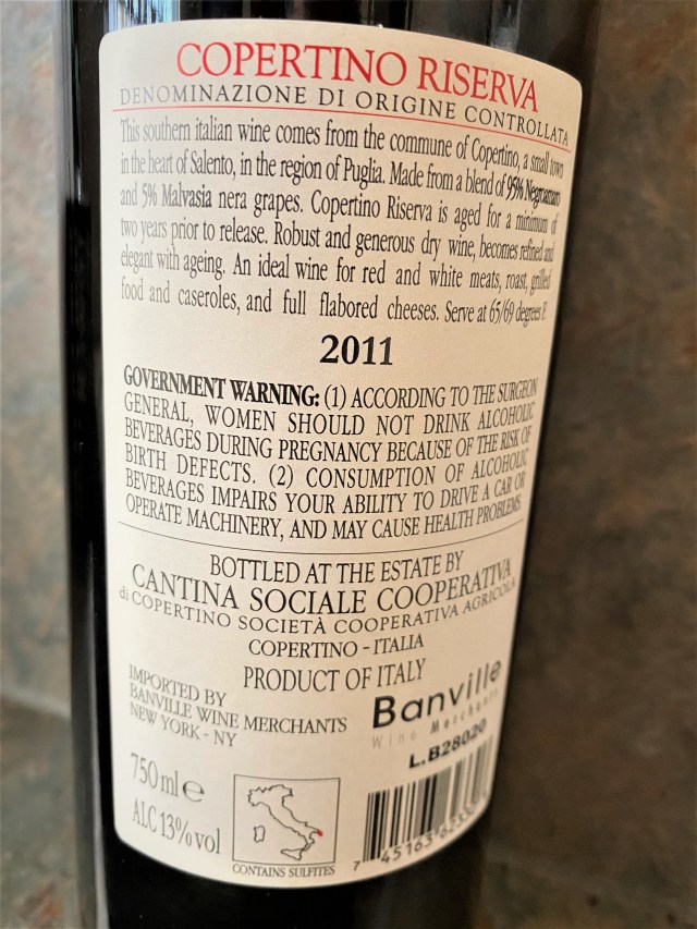 With my eye on the Leg of Lamb, I also went for another sure to please the crowd red wine. The Cupertinum Cantina Social Cooperativa Copertino DOC Riserva 2011 was the wine that I thought of for this dish. The Cupertinum Cantina Social Cooperativa was founded in 1935, along the lines of many of wine cooperatives that were forming in Italy. The Cupertinum cooperative have even planted a micro vineyard in the ramparts of the old Copertino castle. Copertino DOC is in the Puglia region of Italy, the area that most people like to refer to it as the boot, for easy visualization. The main grape for Copertino DOC, whether for the Rosso or Rosato is the Negroamaro variety. Negroamaro must account for seventy percent of the wine, and the balance may have Malvasia Nera, Montepulciano and/or Sangiovese (but only up to fifteen percent Sangiovese). The DOC was classified in 1976 and today there is one-hundred-fifty-eight hectares and about thirty-one-thousand cases of wine are produced. This wine is a blend of ninety-five percent Negroamaro and five percent Malvasia Nera. Maceration on the skins takes about seven days, and then because this was their Riserva, the wine was aged for twenty-four months in Stainless Steel. This wine had the benefit of being an eleven-year-old, so there were already layers of taste to appreciate. The wine was a nice Ruby red in color with nose of black fruit, the tannin had mellowed and matured and offered still ripe fruit and hints of almonds, black currants and leather, with a nice finish. As everyone finally was leaving after a full meal, my Bride was especially happy, because she thought it was the happiest, she had seen her Mother since the lockdown began, because everyone was together, and that is what holidays are for.