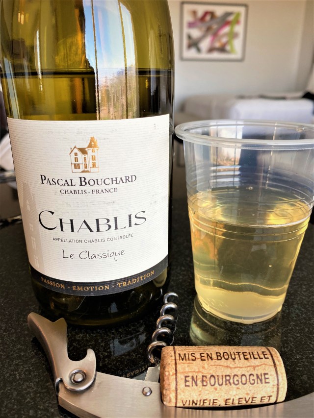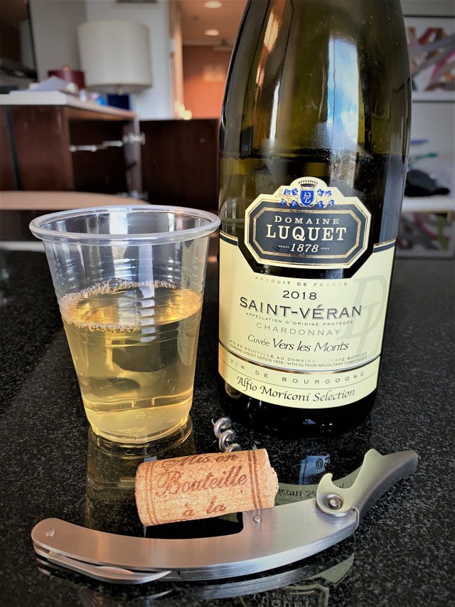 Another reason for checking luggage is so that one can have a corkscrew handy and I always have one in my Dobb kit; I am sure that a cork screw would be deemed a lethal weapon and I can’t travel without a razor or a corkscrew. The first we selected for the room was Pascal Bouchard Chablis Le Classique 2018 and it is pure Chardonnay. Maison Pascal Bouchard is located in the town of Chablis in the northern end of the Burgundy region or department. The fruit for this wine is from both slopes and on the plains with Calcareous (chalky) clay soil. Chablis became a part of Burgundy back in the 15th Century and is even located in a different department, and it is a rather different white Burgundy wine. This wine is aged for around nine months in temperature-controlled Stainless-Steel tanks with the juice on the lees (Sur Lie). This wine offered good citrus notes, both to the nose and in 2018 the taste with a touch of saline from the sea air, and a medium finish of terroir. It was very pleasant and perfect to enjoy in the room, and eventually I hope when there is a return to the old normal, that I won’t have to drink my wine out of plastic cups that were shrink-wrapped. The second wine was Domaine Roger Luquet Saint-Veran Cuvee Vers les Monts 2018. Domaine Roger Luquet in 2017 changed their name to “Domaine Luquet Since 1878” and it has had six generations as the stewards of the land and winery. They own thirty hectares of vines and are predominately Chardonnay with some Pinot Noir for their red wines. The vineyards are in Pouilly-Fuisse, Pouilly-Loche, Saint-Veran, Macon Villages and they also produce a Cremant de Bourgogne. Saint-Veran gets its name from the town of Saint-Verand, but due to some clerical error when the appellation was created in 1971, the town lost a “d” and the wines must be dry white wines made from the Chardonnay grape. The average age for the vines is forty years and this wine is made from a very stony plot and is aged in oak for five months. The wine was a bit heavier and was not as floral or citrusy and offered more of hazelnuts, almonds and a touch of vanilla, and finished with a medium length of terroir of the chalky soil.