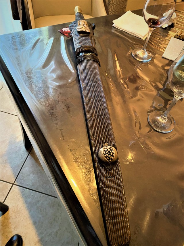 While we were at our son’s house having pizza, he was showing me one of his collecting hobbies. He enjoys collecting curious decanters of liquors, liqueurs and wines. I have leaded crystal decanters, but his are more unique. There are skulls, guns, cars and swords. I am not sure if he has tried the various vodkas, mezcal, tequila and other beverages from these decanters. They remind me of the old ceramic wine decanters of the Fifties and Sixties, that I wrote about a few years ago. Two of the bottles were from Casa Vento winery from Italy. The decanter with the hunter and his dog is Casa Vento Chianti, but there is no black cockerel on the bottle. The other of a Falstaffian individual sitting on a couple of wine barrels, while he holds another wine barrel above his head with the tap open is a Casa Vento Vino Santo Duca D’Asti. Both of these bottles have no vintage years on the labels, so I can presume that the wine was bulk table wines made for immediate drinking, and the decanters were more costly than the wine. Both of these wines were imported by Vento Wine Import Inc. of Cleveland, Ohio, and I wonder if this was a vertical structure of the winery at one time. I did a search of the import company and the last listing I could find was 1972. There is a Casa Vento Winery in Italy at the present, but I could not verify, if this is the same winery on the decanters.