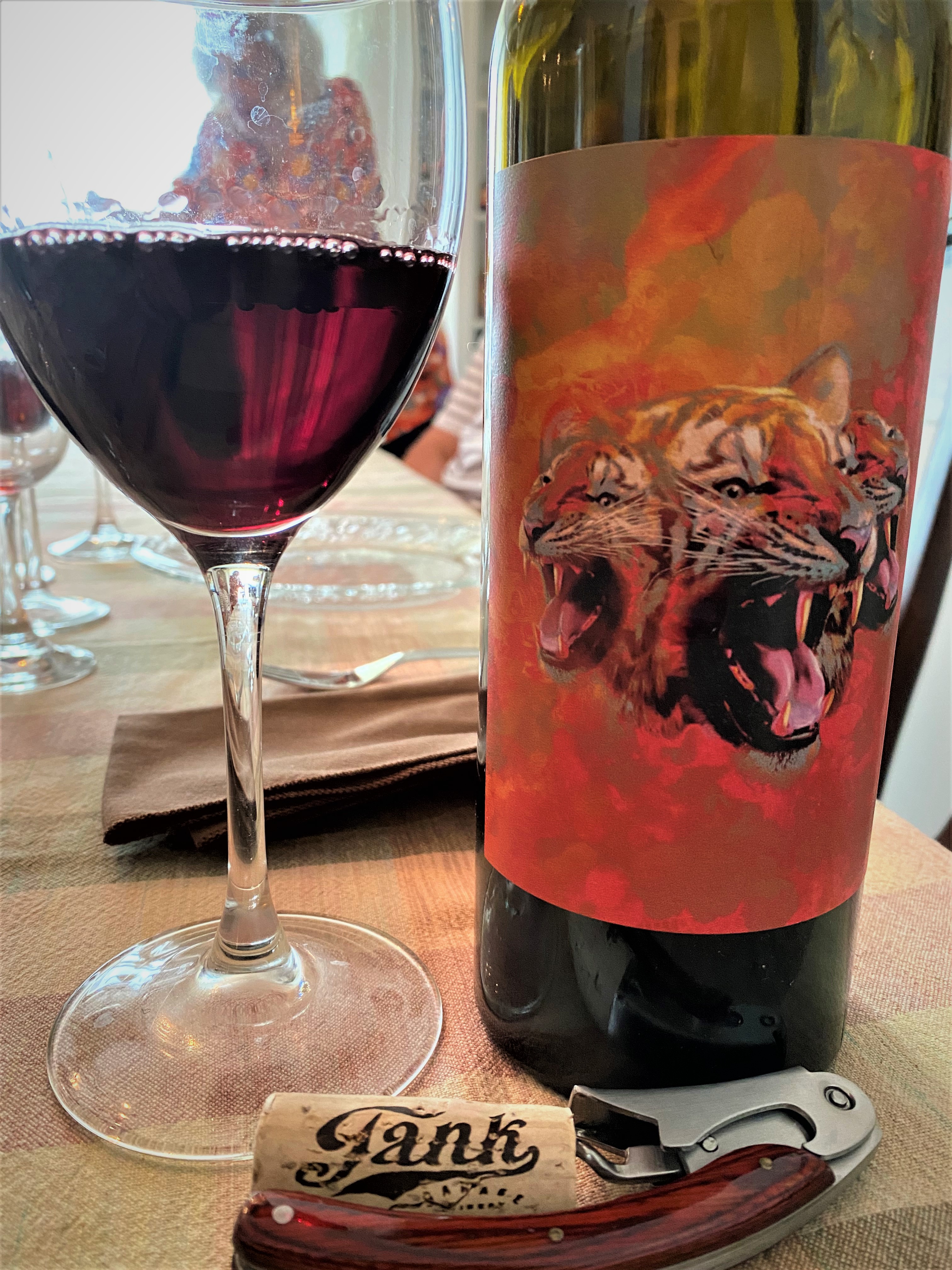 When we shifted to the Dining Room, it was now time for the second half of the dinner. We started off with an imposter, my Bride did a commercial Caesar Salad, and may I say “never again.” It is alright to try a Brand X when one is out and about, but not at home. We had a marinated Pork Tenderloin using Garlic, Rosemary and aged Balsamic and a side of sauteed diced fennel and onions as a side. We paired this dish with Tank Garage Winery Dopamine Red Wine Sierra Foothills 2019. Dopamine is a medication form of a substance that occurs naturally in the body, and it improves the pumping strength of the heart and improves blood flow to the kidneys, and I thought that was a unique name for a wine. This wine was sixty-one percent Tempranillo, twenty-six percent Graciano and thirteen percent Syrah and it had a nice blood color to it, if I can interpolate. The wine was aged for fifteen months in neutral oak and there were three-hundred-fifty cases produced. This wine got everyone’s attention with a nose of strawberry and huckleberry mentioned by almost all. It had a fruit forward offering of red fruits, mostly dry with a nice finish. It paired very with the pork, but it also was delightful with the fennel and the onions.