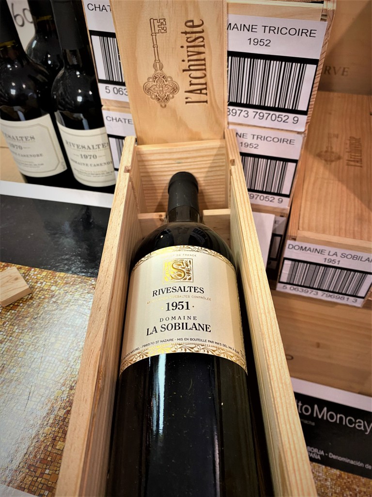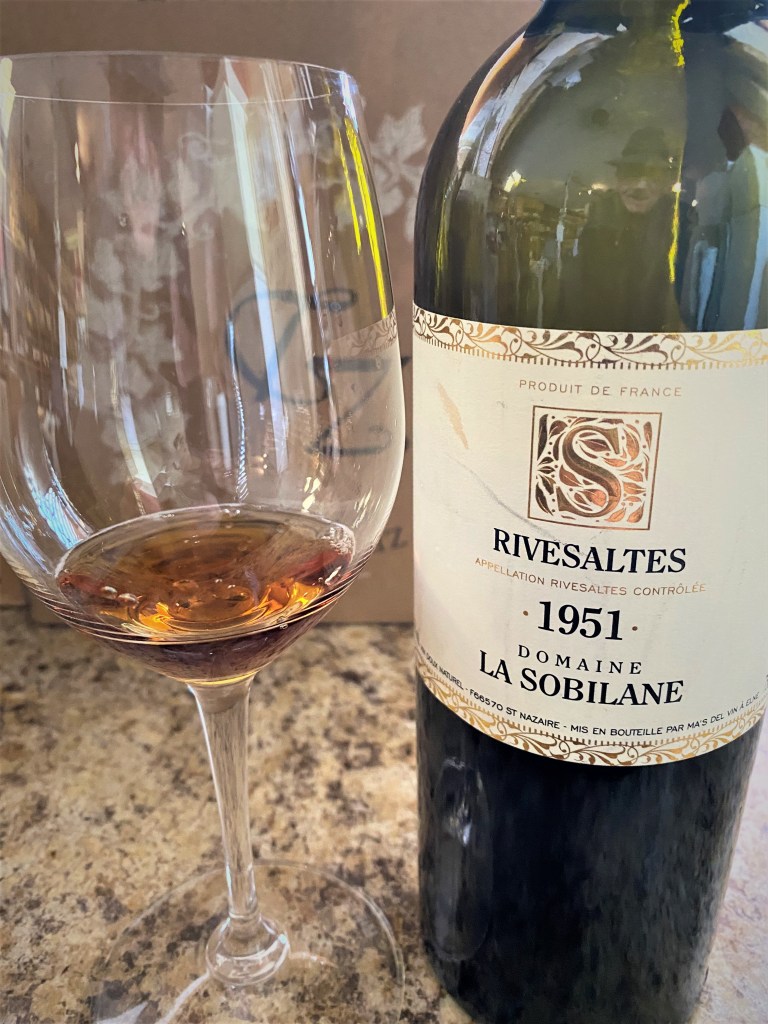We were tasting Domaine la Sobilane Rivesaltes 1951.  The Forties and the Fifties were considered the Golden Age for Rivesaltes. Domaine la Sobilane are known for oxidizing their Grenache Noir for three years in demijohns and demi-muids, which are glass bottles also called bonbonnes.  While the wine is in these sealed bottles, they are may be left outside in the elements and exposed to sun, rain, temperature swings and extreme weather, which allows the wine to maderise.  Then the wine matures in barrels for a minimum of four years.  It reminds one of a Tawny Port, but the Grenache delvers a different twist to the experience.  This wine was just a delight with layers of flavors.  For its age, I was amazed at how crisp and balanced the wine was, a little bit of honey, notes of almonds or marzipan (an old addiction of mine, but only for quality marzipan made by the old confectioners) and a finish that had a very long count.  A beautiful wine that really needs to be at the tail end of an exquisite dinner, and with only people that can really appreciate a sublime wine to finish off the night.