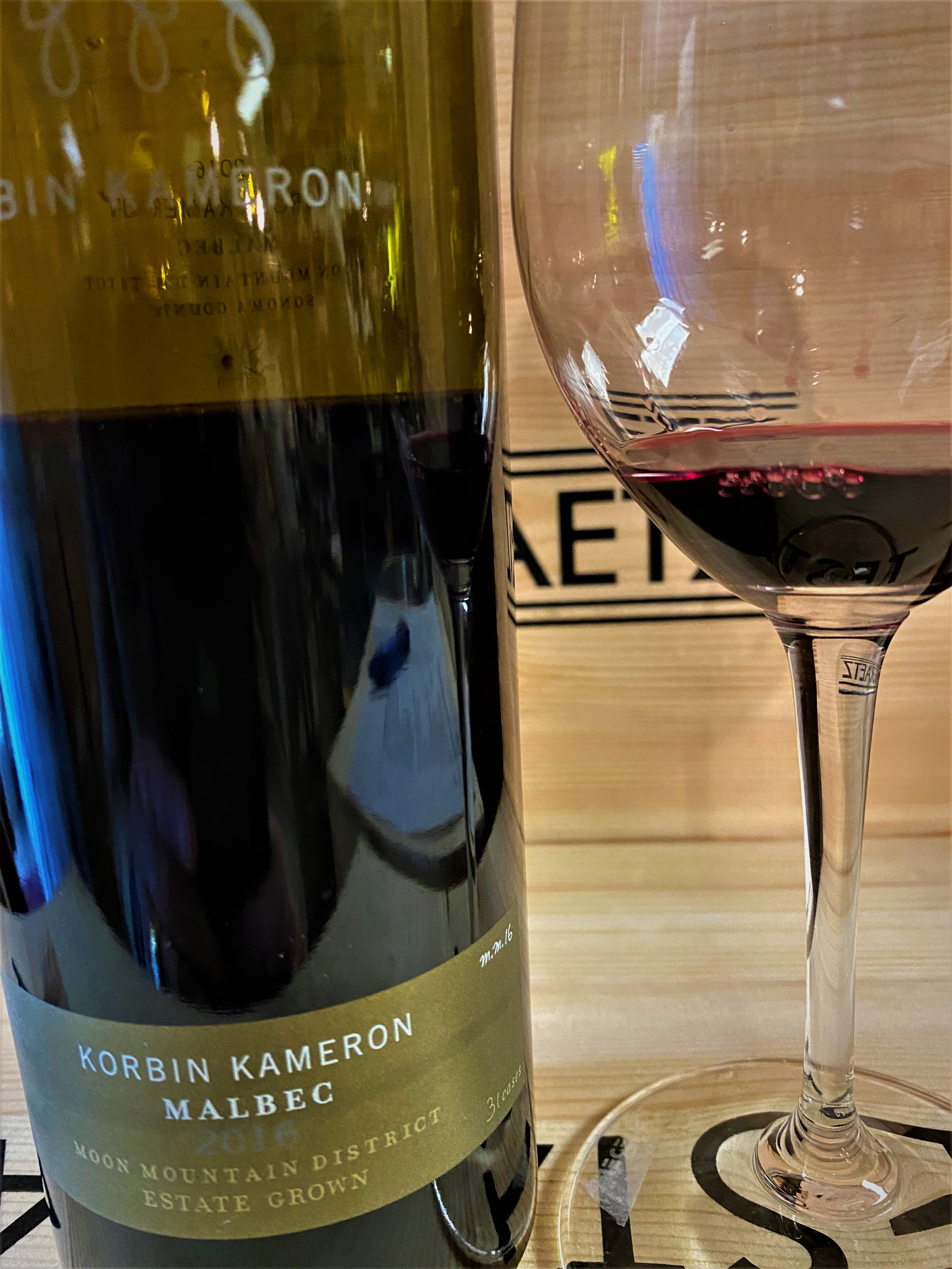 Korbin Kameron Malbec Moon Mountain District 2016 is an Estate Grown wine. Malbec tends to be one of the forgotten grapes of Bordeaux, the important grape of Cahoors and Argentina. Here is a wine that was aged for eighteen months in French Oak and half was new. The wine was an inky dark purple, the kind that stains your teeth so easily. The nose was a mix of dates, plums and some chocolate (which is one of the ethereal notes that I seldom notice). It was fruit forward with flavors of dark bramble fruit and very concentrated flavors and tannins with a softer finish of terroir. This was a wine that my Bride was gushing over and usually not about a Malbec, so it is very easy, just to jot down numbers as you try to figure out your order. It is not often that I find such wonderful wines, especially in such limited production of three hundred bottles and I really can’t wait to see what some cellar time does to this wine.