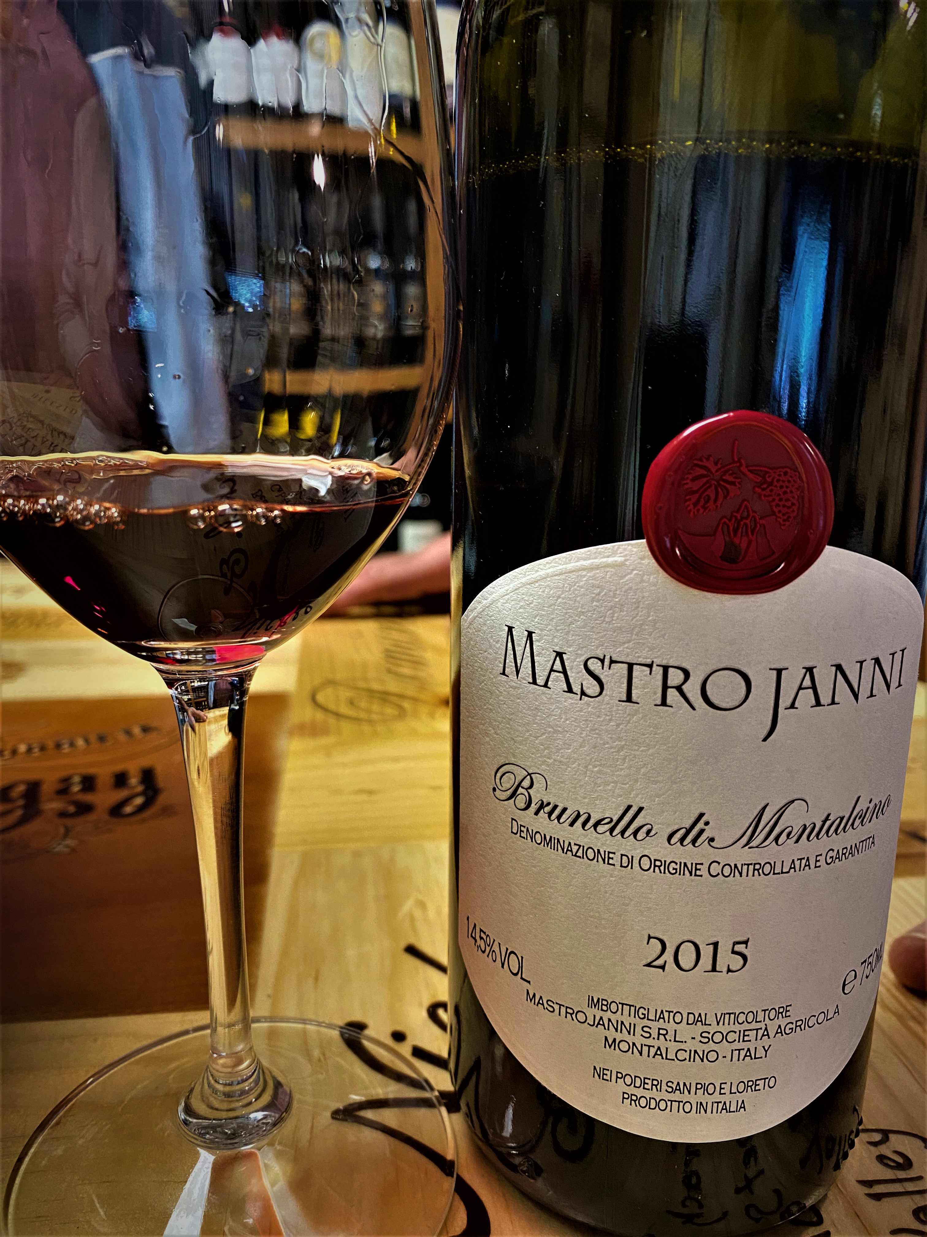 I was tasting Mastrojanni Brunello di Montalcino DOCG 2015 and it is pure Sangiovese or locally known as Brunello. A lawyer, Gabriele Mastrojanni created the winery in 1975 when he bought the San Pio and Loreto estates and planted vines where it was meadows and woods. There are ninety-six hectares of land, with thirty-three hectares planted in vines, but only seventeen hectares qualify to be Brunello di Montalcino. Their cellar is built partially into a hillside and it has cement tanks and barrels for long term storage. Since 2008, they are part of Gruppo Illy, the coffee people, and Francesco Illy has been an owner-winemaker at a neighboring estate since 1997; he has kept the same original winemaking team at Mastrojanni since the purchase. This wine spent thirty-six months in oak and an additional six months in the bottle, before distribution. The wine is a pretty ruby-garnet red with a nose of dark fruit and spices, a beautiful chewy wine with tannins that need to be mellowed out with some additional aging and a nice long finish.