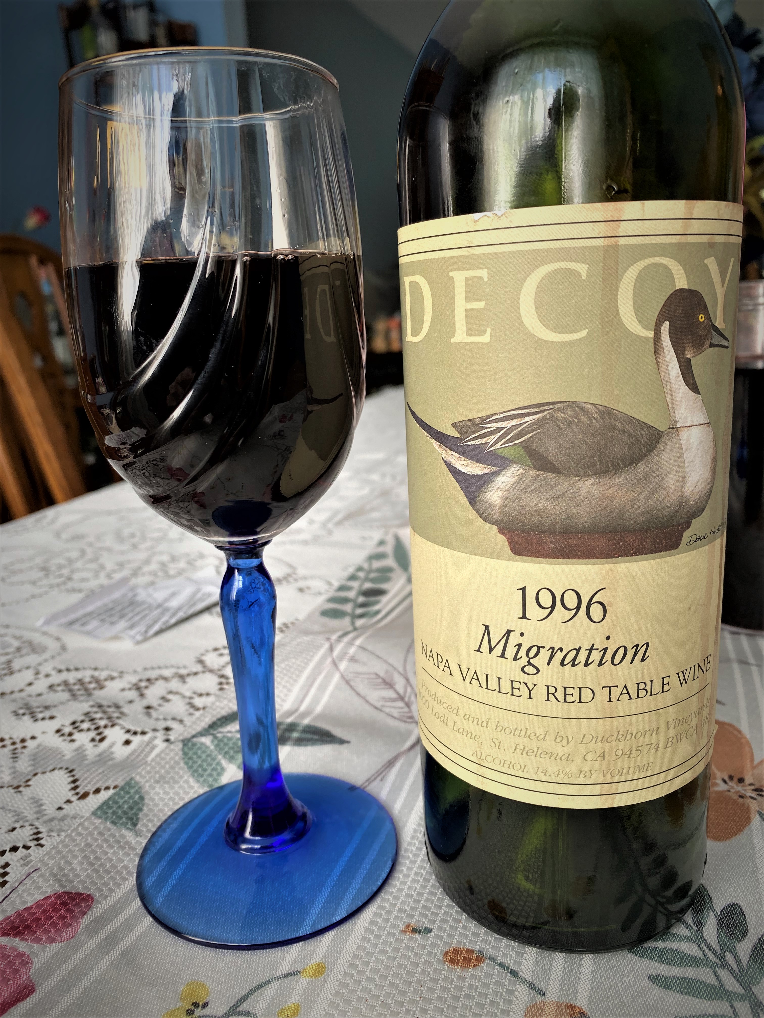 The dinner segment was just a casual, as it was a barbecue of bratwursts and hamburgers, along with the classic sides that one would encounter at a cookout like this. Later on, there was the sweet table and the obligatory birthday cake. Since I was one of the honorees, I did bring a special bottle from our cellar, just to see how the wine was progressing as we have some more of the wine resting. We had a bottle of Duckhorn Vineyards Decoy Migration Napa Valley Red Table Wine 1996, which we bought at the winery. Years ago, we had the good fortune to have a private tour and tasting during harvest with one of the Duckhorn sons and at that time, the wine was a blending of different varieties and different contract and owner properties, back when Duckhorn Vineyards produced all of their wines in Napa Valley, now Duckhorn is one subsidiary and Migration is another subsidiary. The original concept for Migration is that the wine could change from year to year. This wine was produced from fruit harvested from seven different vineyards within the appellation. The wine was fifty-one percent Cabernet Franc, twenty-six percent Merlot, thirteen percent Cabernet Sauvignon and ten percent Petit Verdot. The wine was aged for eighteen months in a blend of sixty percent French Oak (ten percent new, sixty percent second and thirty neutral) and forty percent American Oak (all second use). Silly me, I forgot to pack my Durand and of course the cork broke and I had to use a coffee filter and a funnel to decant. This wine was just beginning to show its age, but the nose was vintage Right Bank, the nose and the tannins were soft, but it was still a chewy wine with a good long finish. For a twenty-five-year-old, it behaved very nicely and a pleasure to drink.