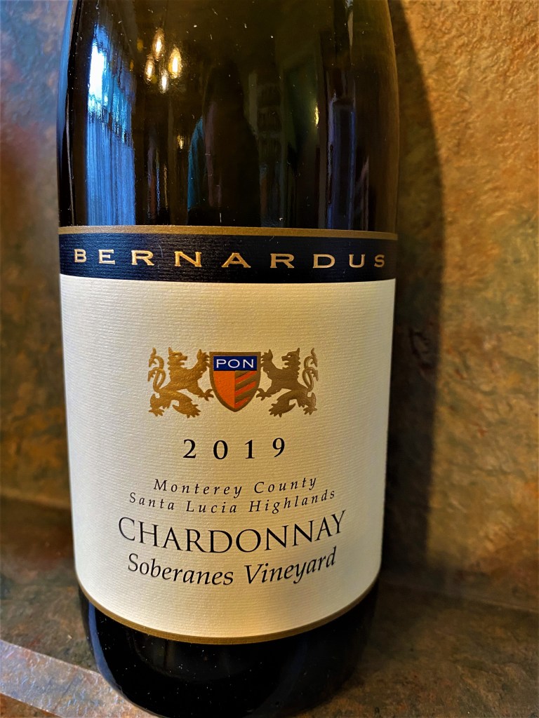 Bernardus Winery Chardonnay, Soberanes Vineyard, Santa Lucia Highlands 2019 was the first bottled I pulled out of the carton. Bernardus Winery and Vineyards was founded by Ben Marinus Pon about twenty-seven years ago with the intention of creating premier wines in the Carmel Valley. His intent was to produce single vineyard designated wines and a Bordeaux blended wine. Soberanes Vineyard is a joint venture of two famed growers Gary Pisoni and Gary Franscioni in the Santa Lucia Highlands. This wine is made in the “Burgundian tradition” and it is almost twelve months between harvest and bottling. The wine is aged in French Oak, of which forty-three percent is new. According to the write-up, this wine has a nose of baked apple and crème fraiche, exhibiting white fruit on the palate along with buttery oak notes and a full finish.