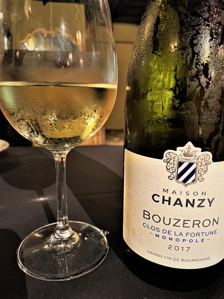I ordered a bottle of Maison Chanzy Bouzeron Clos de la Fortune Monopole 2017, and the Sommelier arrived with the bottle, because she was very curious to see who had ordered this wine, and I have to admit that it happened the same way the last time we ordered the wine, but it had been a vintage 2015. Maison Chanzy used to be known as Domaine Chanzy and they own eight hectares spread across three Burgundy Cotes, with the majority of the plantings in the Cote Chalonnaise and with an historical presence in Bouzeron, and it is Bouzeron that they are most proud of, and willing to tell the world about it. Bouzeron is a small village that now has its own appellation since 1998, but only for white wines made from the Aligoté grape, and for years it was listed under a sub-division title of Bourgogne-Aligoté. Bouzeron is in the northern Saone-et-Loire region of the Cote Chalonnaise, in the valley and the Dheune River separates it from Santenay and it is very close to Rully and Chassagne-Montrachet. Eighty percent of the juice is done on the lees in Stainless Steel and the balance in oak and it is bottled in the summer, to maintain the fruit and youthfulness of the Aligoté grape. As you may have noticed Maison Chanzy owns the entire Clos de la Fortune and they are very proud of it, as part of their domain. The wine offered nice herbal notes, and some great terroir (flinty from all of the limestone soil of the area) with a nice refreshing finish. We did have a dessert and when the bill came, the restaurant gave us a gift certificate to be used on our next trip, and I know that we will.