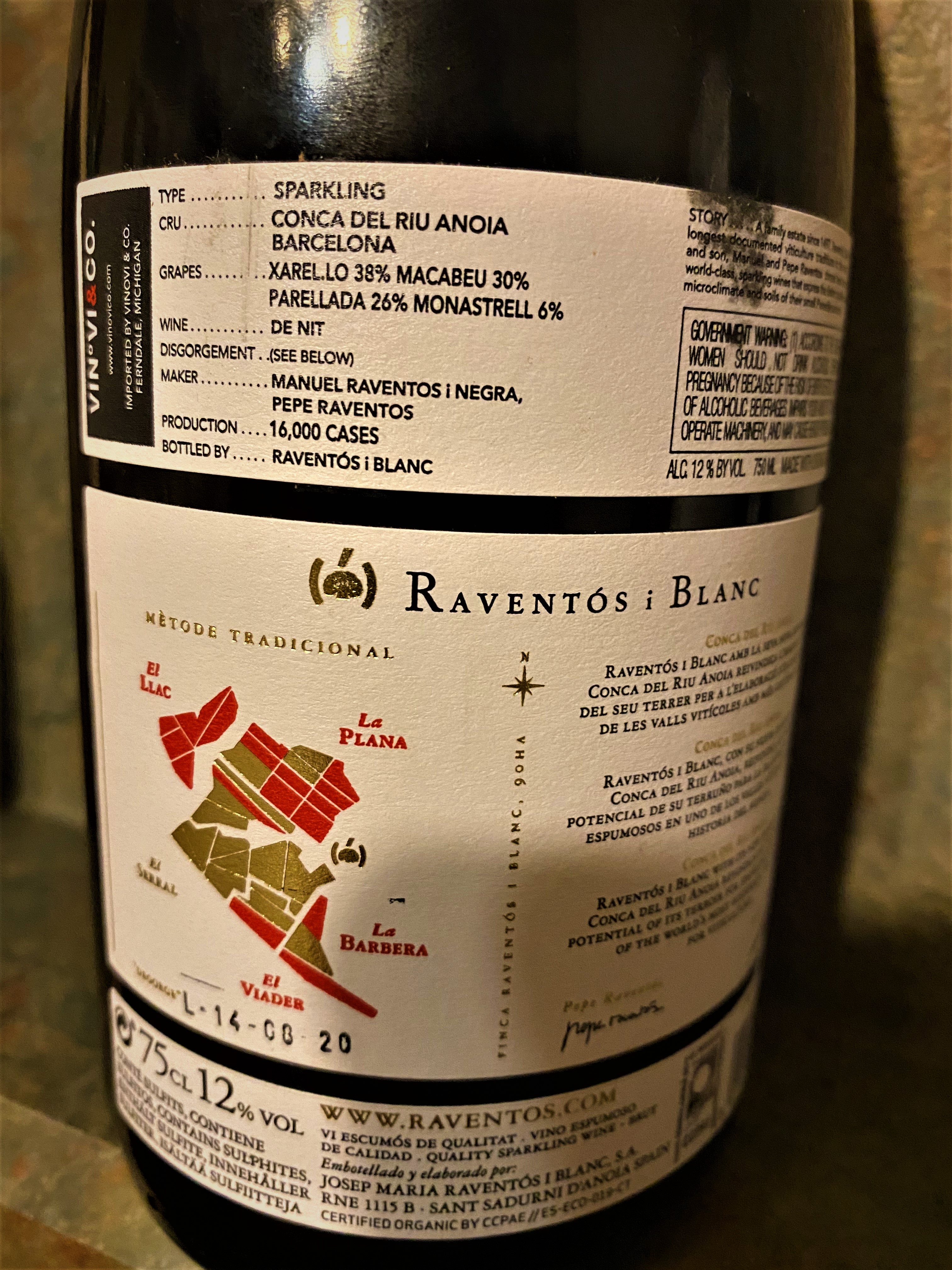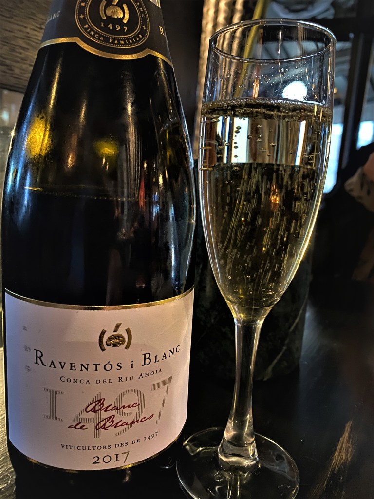 They had a nice collection of wines on their carte, most were available by the glass, so I had to act quickly and I found a nice sparkling wine from Spain, and those are two “buzzwords” that attracted my Bride’s attention. We ordered a bottle of Raventos i Blanc Blanc de Blancs Conca del Riu Anoia 2017. The Raventos family has a wine making history going back since 1497, five centuries of working ninety hectares of vines and twenty-one generations of winemaking. In 1872, Josep Raventos Fatio went to Champagne and then made his first sparkling wine with secondary fermentation in the bottle, using only native estate grapes. Josep Maria Raventos i Blanc, was the promoter and creator of the Cava DO, and in 1986, he produces the first estate Cava. They are striving to have the region Conca del Riu Anoia, classified, it is a small geographical area centered around the River Anoia Basin, between the Catalan Pre-Coastal and Costal Ranges. The wine is a blend of thirty-eight percent Xarel-lo, thirty percent Macabeo, twenty-six percent Parellada and six percent Monastrell. The wine was made in the classic traditional method with the disgorgement (secondary fermentation in the bottle) done in October 2020. A delightful bottle of wine, that just made it through the dinner, with its tiny bubbles in a pretty gold color. I find sparkling wines harder to describe especially since I am not partial to descriptors, but this wine was fresh with a youthful excitement, for a lack of better words. It was slightly sweet, as I am not partial to bone-dry sparkling wines and we both enjoyed it, and it would be very easy to order it again, it was that nice.