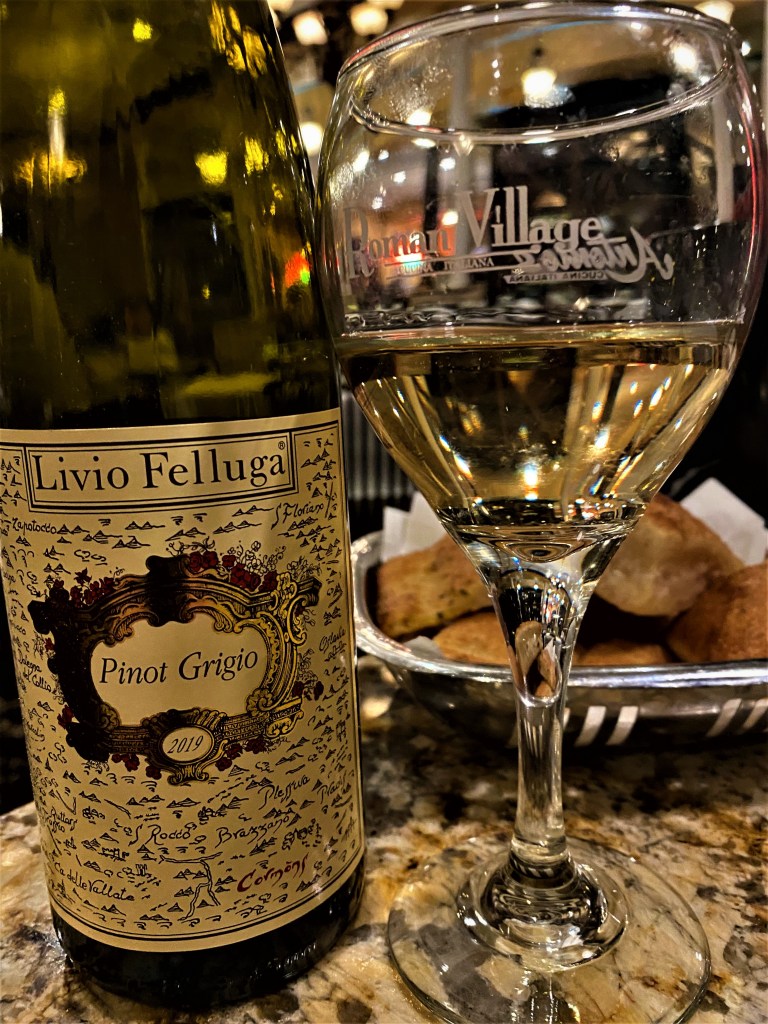 With all of the dinners ordered, it was easy, as I knew that we were going to have a white wine, of course, we knew that before the dinner selection, as the other couple only drink white wine. We had a bottle of Livio Felluga Pinot Grigio Colli Orientali del Friuli DOC, Friuli-Venezia Giulia 2019. Livio Felluga is named after its founder, who came to the region in the 1930’s, and is most known for their blended white wines. The family goes back six generations of wine makers originally from Isola d’Istria in modern day Slovenia. Friuli Colli Orientali DOC (Eastern Hills of Friuli) is a famed district noted for the stratified, mineral rich soil, layers of marl and sandstone. The fruit was hand-harvested and gently destemmed and maceration and fermentation was done in Stainless Steel vats on the lees for several months, and then aged for a short time in the bottle before distribution, The wine was a pretty straw color with a nose offering floral notes and white fruit and natural spice. On the palate it had very pleasant fruit, with a tanginess, and a nice medium length finish of fruit, salt and terroir. I think everyone was pleased, because they all wanted seconds.