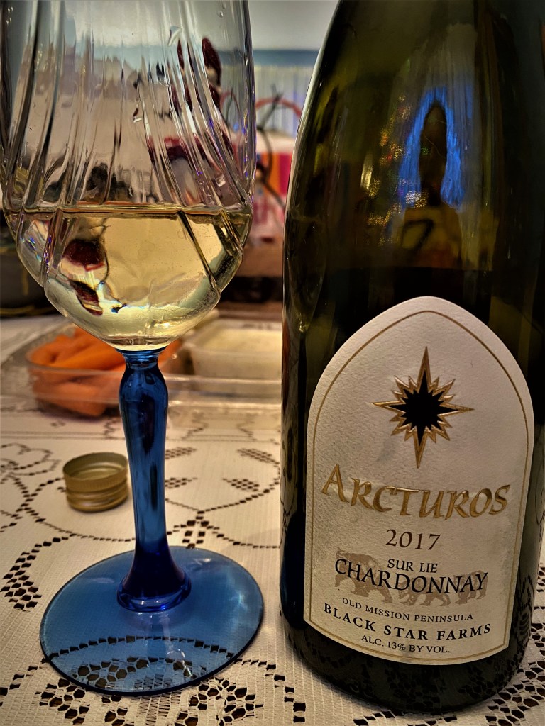 So, I just kind of stayed put for the entire time and a lot of the other men ended up sitting at the table, as the sisters seem to congregate at the kitchen table. My Bride when she wasn’t playing cards or putting out appetizers or reheating all of the food that we brought from the night before, would bring me plates of cheese and crackers, and she would also get a pour of wine, in fact my table was good for visiting, because of the wine. The other great thing is that she has finally stopped asking me what I would like on my plate. You understand that since she is already in the kitchen with the buffet set-up, I am just one less body to add to the congestion of an ad-hoc buffet line. Speaking of wine, we also opened a bottle of Black Star Farms Arcturos Sur Lie Chardonnay Old Mission Peninsula 2017, a Michigan wine. Black Star Farms is rather unique in that it has vineyards and tasting room facilities on both peninsulas, so that they are kind of surrounding Traverse City which is kind of the focal point for all of the wineries in the area. In 1998 Black Star Farms purchased Sport Valley Farm which was a one-hundred-twenty-acre equestrian facility, and the stylized black star was part of the architectural décor in the main house. This was a nice medium bodied wine done in Stainless Steel. It offered notes of ripe citrus, and some floral and finished with a bit of terroir.
