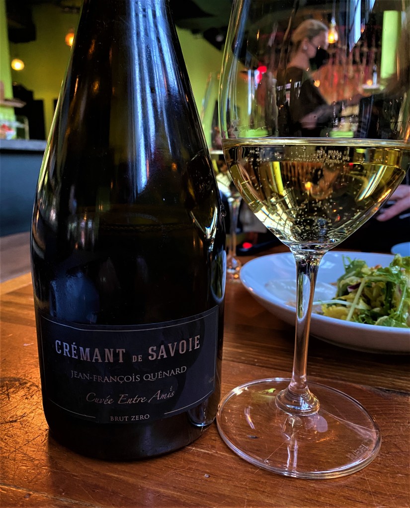 Chartreuse Kitchen and Cocktails prides themselves on their selection of Chartreuse, unique cocktails and a tight and curated “organic” wine carte. As I was studying the menu, I was trying to juggle different dishes for a wine, and then I just selected some bubbles. I mean, how many people have told me that they enjoy bubbles with any dish. We had a bottle of Jean-Francois Quenard Cuvee Entre Amis Cremant de Savoie Brut Zero NV. Cremant de Savoie is the eighth region to get the Cremant designation in 2015, prior they had to be labeled Vin de Savoie Cremant. In 2018, there was a total of fifty-seven hectares among a possible forty-four villages that can produce the wine. In the region there are several Quenard families, so the first names are also listed on the labels. The family domaine of Jean-Pierre and Jean-Francois, has been handed down by family since 1644. The family estate is seventeen hectares on a mix of clay and limestone grounds. The wine is made of sixty percent Jacquere, twenty percent Pinot Noir and twenty percent Chardonnay; Jacquere is an indigenous grape and must make up sixty percent of the blend. The initial fermentation and then the malolactic fermentation is done in Stainless Steel, then bottled and aged on slats for fifteen months with no additional dosage; though by law this wine can be made up to demi-sec depending on the market. The wine was a pretty gold color with small bubbles. Notes of cut grass and apples, with a delightful acidity with plenty of freshness, and a nice finish that just wanted you to have another taste. A very pleasant wine with the assembled plates that we enjoyed.