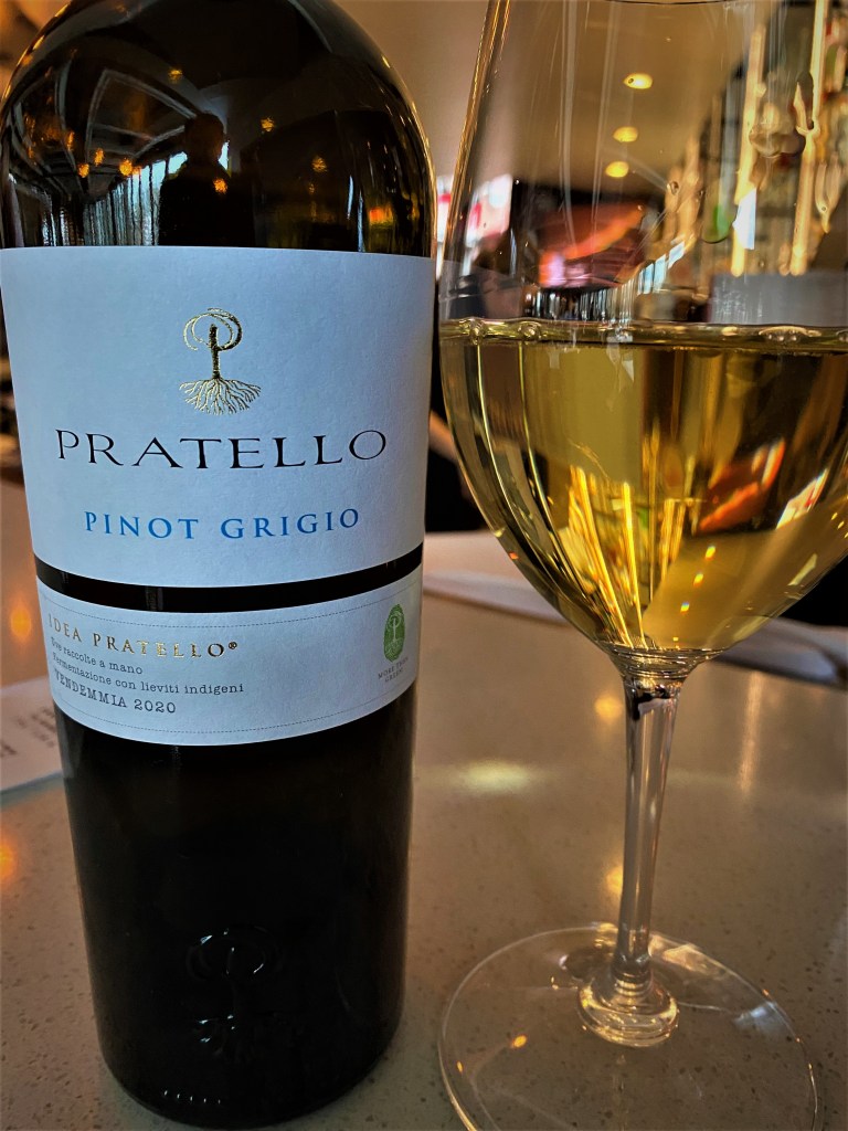 I did mention that we were sitting at a bar. We had Henri Gaillard Cotes de Provence AOP 2020. Henri Gaillard was the best negocient in the Cotes de Provence area for Crus et Domaines de France. He was a descendent of an old Languedoc family and is regarded as a pioneer for the South of France. The Cotes de Provence is the largest growing region in Provence. The Cotes de Provence was originally a VDQS designation in 1951, encompassing forty-two communes. In 1977, it was awarded AOC status and covers eighty-four communes. This wine is a blend of Syrah, Grenache, Cinsault and Mourvedre. The wine I am sure was done in Stainless Steel with minimum aging. The wine offered notes of strawberry, rose petals and spices, and on the palate, it was a dry wine with good acidity, offering red fruit, florals and some light spices. Then we had Pratello Pinot Grigio Garda DOC 2020 from Azienda Agricola Pratello di Bertola. Pratello was founded in 1867 on the morainic hills off of Lake Garda. The estate is now one-hundred-twenty-hectares, of which eighty are vineyards and the balance is for olive groves and borders two districts; Valtanesi and Lugana. Lake Garda is Italy’s largest lake and it splits up two DOC areas; Lombardy and Veneto. In 2017, Garda DOC combined with Valtanesi and Riviera del Gard Bresciano to become the Riviera del Garda Classico DOC. The fruit is hand harvested with a soft pressing in Nitrogen saturation. The initial fermentation is for about fifteen days, and then aging in Stainless Steel for five months, with an additional bottle aging for three months. The wine was a pretty golden color with notes of pear and golden apples, and on the palate, great citrus flavor and acidity and a finish of fruit. After dinner, we had to go back into the market, as someone wanted more of this wine.