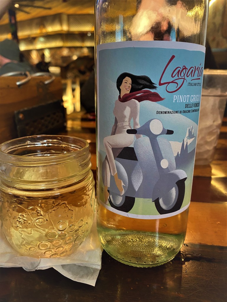 I looked at the wine list and chose for the two of us, what I thought would be best with the barbecued (smoked) food and selected Lagaria Italian Style Pinot Grigio Delle Venezia DOC 2020 by Empson & Co. wine producer and importer. Empson & Co. have been exporting Italian wines since 1972. I am not sure what Italian Style meant, but it did carry the Delle Venezia DOC which was good. I could not find anything on Lagaria the winery, but the fruit is harvested from the Lagarina Valley on a clay and sand soil and the age of the vines are from five to twenty-five years. The fruit is hand-harvested and destemmed and cold maceration for a few hours and then fermented on the lees for ten days and then aged for a few months on the lees in Stainless Steel. A pretty light straw color with notes of citrus and floral, on the palate offerings of tree fruit like apricot, apple and pear and a short finish. The was a bit sweeter than I had expected, but with the smokiness of the food, I thought it worked well and I am glad that I didn’t get a red. A unique experience and there will be one of the chain locations coming to our region soon, in case we are taking out our grandson to eat.