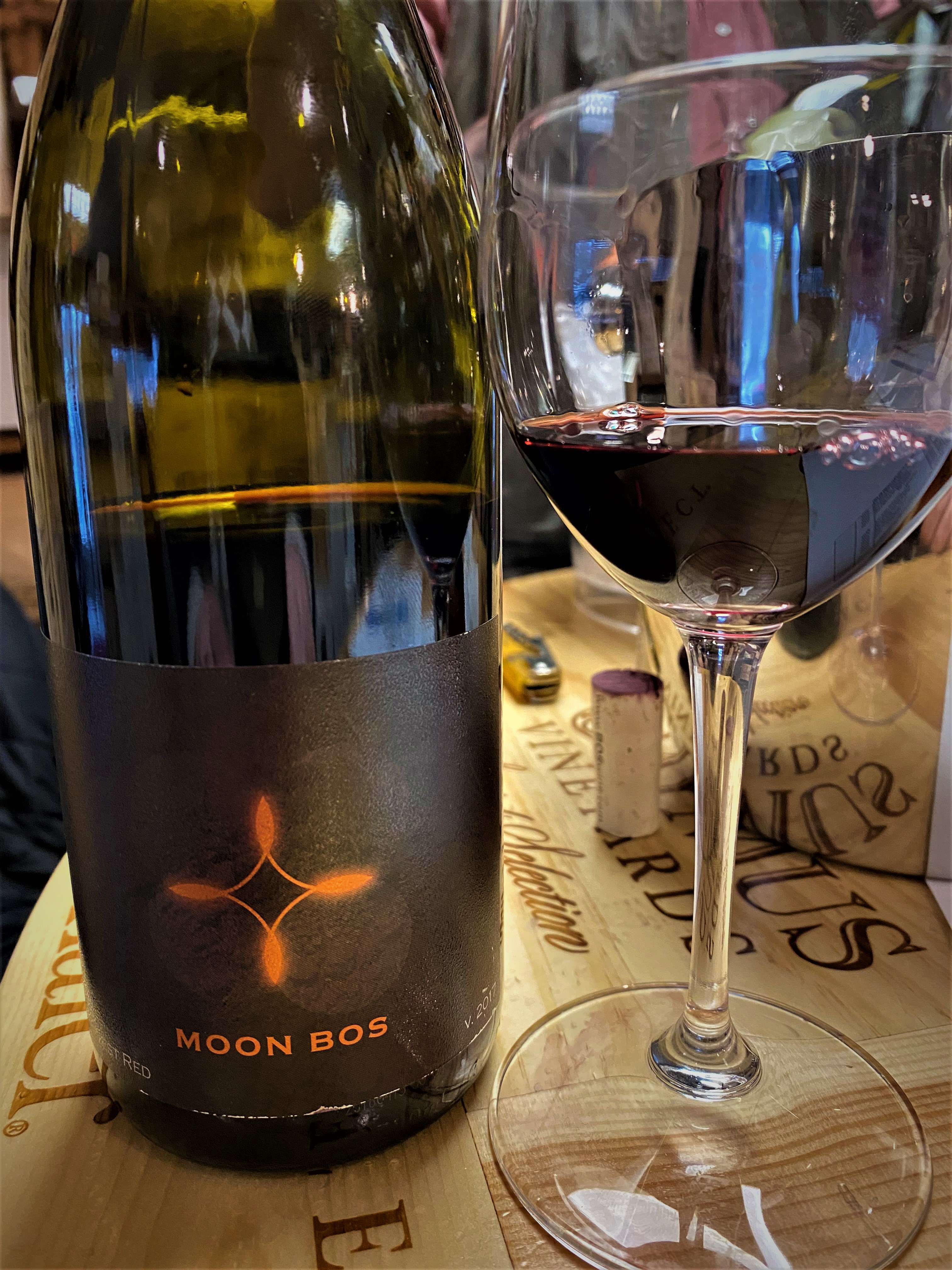 The Moon Bos Wine Harvest Red Blend California 2017. The wine is mainly Syrah with a little Petite Sirah and a touch of Mourvedre. The wine was fermented and aged in neutral oak, so as not to alter the Syrah. A nice deep color with notes of black cherry and lavender. On the palate it offered black fruit and balanced tannins, with a very nice finish offering traces of graphite.