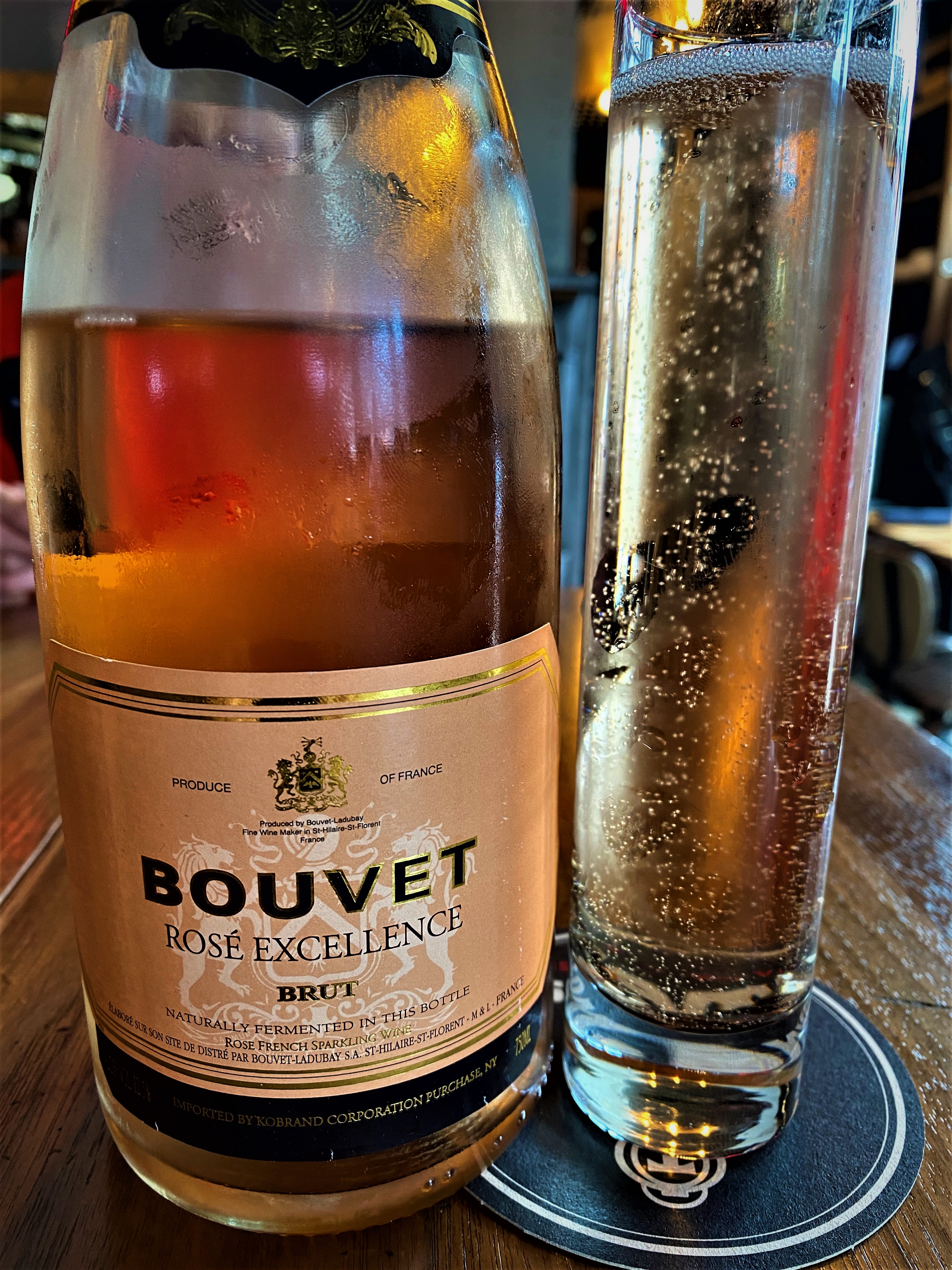I went with the Townhouse burger that was highly touted by our waitress, it was dry-aged beef and hand formed, with Bourbon Glazed Onions, and White Cheddar on a Brioche Bun and served with their Truffle Fries along with Gremolata and a Rosemary Garlic Aioli. For not being a steakhouse, it was a very good burger, and I actually ate the fries. I joined my Bride and had some bubbles as well. I had Bouvet-Ladubay Excellence Brut Rosé NV from the Loire. The estate was founded by Etienne Bouvet in 1851, making sparkling wine in the valley. The fruit is from the Saumur area, which is a mix of clay and limestone. The wine is made from Cabernet Franc and the color is achieved from a rapid maceration, before the initial fermentation in Stainless Steel. The second fermentation is done in the bottle and the bottles are automatically riddled by gyro-pallets to speed up the Methode Champenoise. The wine had a pretty salmon-pink shade with tiny bubbles with notes of cherries and figs. On the palate a creamy mousse of red fruit, biscuits and a nice terroir driven finish. My Bride said that I picked the better wine again.