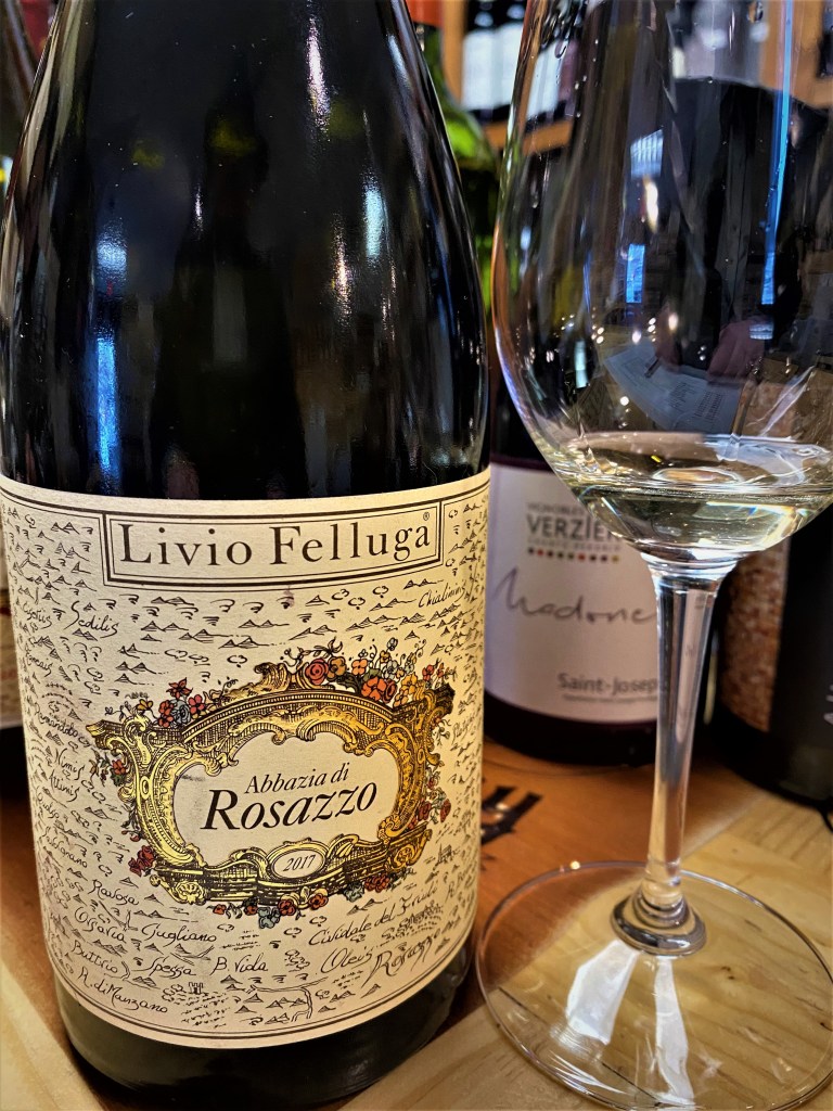 Livio Felluga “Abbazia di Rosazzo” Rosazzo DOCG 2017 was the second wine from this winery. The winery has encompassed the cellars and vineyards of the historic Abbazia di Rosazzo (Abbey of Rosazzo) and its distinctive white wine blend of Friulano, Pinot Bianco, Sauvignon Blanc, Malvasia Istriana and Ribolla Gialla. Rosazzo is the most recent DOCG designation (2011) in Friuli-Venezia Giulia and the mineral rich grounds surrounding the Abbey. Here the vines are older, lower yields and flavor concentrated grapes. Tradition holds that the area was planted in the Middle Ages and that a local patriarch in the Fourteenth Century declared that anyone not planting vines would be excommunicated. The blend is celebrating its thousand-year-long history of viticulture. Friulano must make up fifty to sixty percent of the final wine, Sauvignon and Pinot Bianco both will be twenty to thirty percent and Ribolla Gialla at no more than five percent. The grapes are hand-picked in small crates and gently destemmed and left to macerate for a short period, then it is soft crushed. The must ferments in Stainless Steel, then the wine is raced into oak casks on the lees for a minimum of eighteen months. The wine is a nice yellow color with notes of white fruits, florals, hay, herbs, spices and vanilla. On the palate there is a richness of Crème Brulee with tones of pineapple and very refreshing with a beautiful finish of spices.