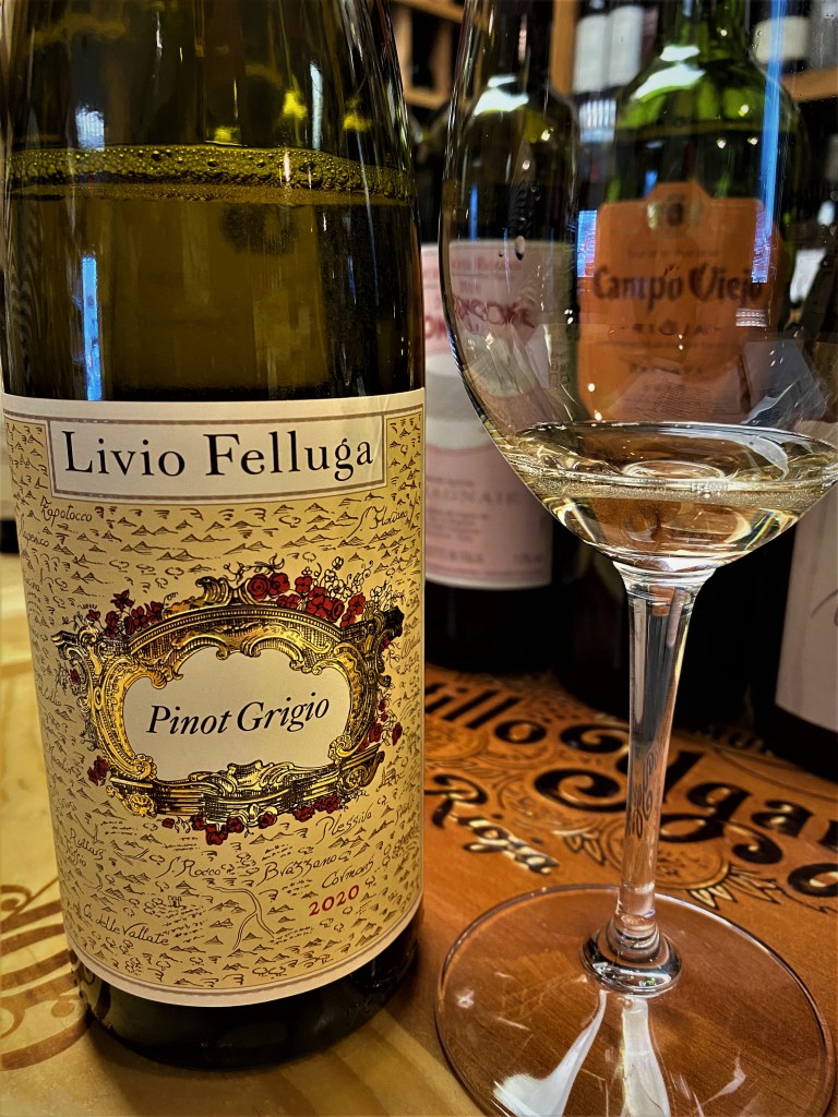 Livio Felluga Pinot Grigio Colli Orientali del Friuli 2020 was the first of the two wines that we tried from this winemaker. The estate takes its name for the founder Livio Felluga who came to the region in the 1930’s. The family has been winemakers for six generations in Isola d’Istria in Slovenia. Today the estate is comprised over one-hundred-eighty-seven-hectares of vines. The winery is predominately white wines, but they do a few red wines as well. Friuli Colli Orientali or the “eastern hills of Friuli” was designated in 1970. This Alpine region naturally has a higher altitude and the vineyards are terraced on basically alternating layers of marl and sandstone. The fruit for the wine is hand-picked in small crates, and gentle destemming, the fruit is left to macerate for a short period, then softly crushed. Temperature controlled fermentation follows in Stainless Steel, and then the wine is kept on the lees for a few months, then it is bottled and matured additionally in temperature-controlled rooms. The wine is straw colored with notes of white and yellow fruits and florals. On the palate crisp tones of peaches and apples with a tinge of tea, bright and tangy with a nice medium count finish of terroir and a touch of salt, calling for another sip.