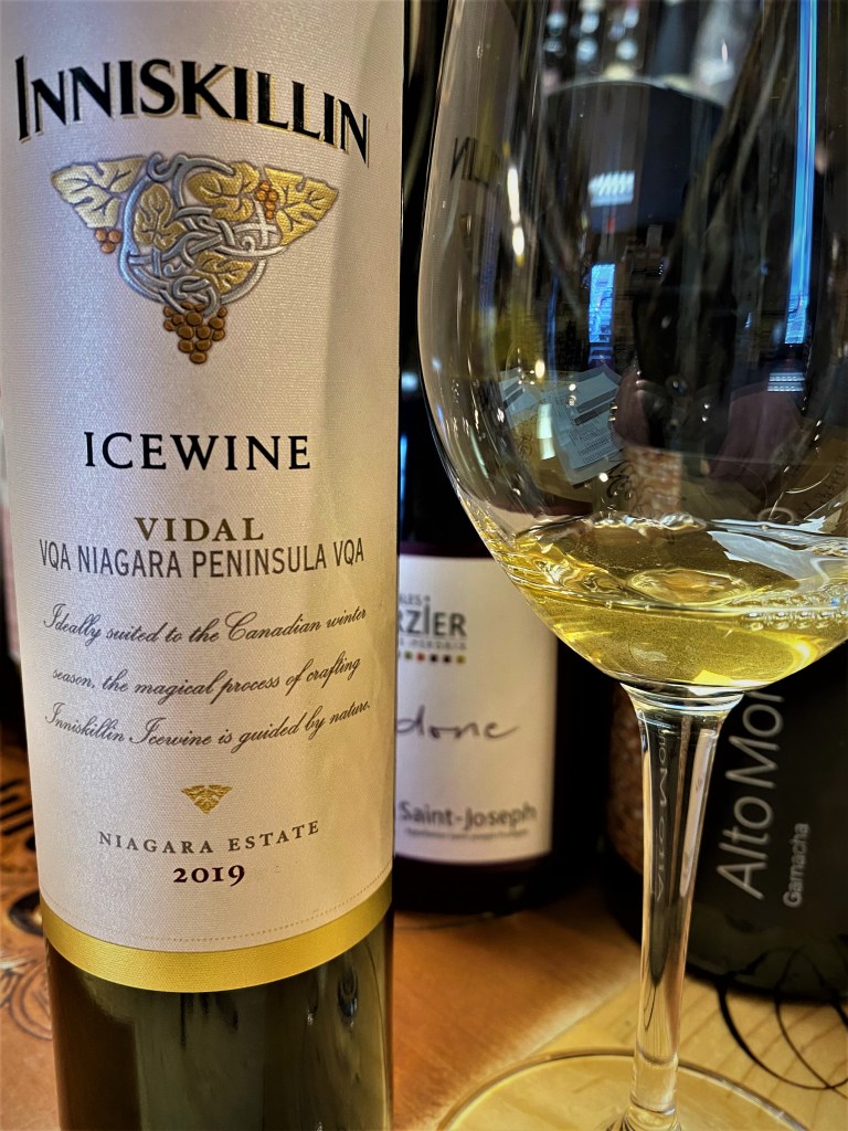 There is always room for Inniskillin Wines Vidal Ice Wine, Niagara Peninsula VQA 2019 and they now also have a winery in the Okanagan Valley in British Columbia. They have really created a name for themselves and Canada for their ice wines made from Vidal, Riesling and Cabernet Franc. Inniskillin Wines were granted a winery license in 1977, the last winery licensed was in 1929, and their first vintage was in 1977. In 1984 they produced their first ice wine from naturally frozen Vidal grapes and won the Grand Prix d’Honneur at Vinexpo in France in 1991 with their Vidal Ice Wine. Vidal is a hybrid of Ugni Blanc and Seibel that is a Cold-Hardy grape. The grapes are harvested at night when eighty percent of the water content in each berry is frozen. The grapes are pressed while still frozen (artificially freezing the grapes is prohibited) and the grapes may be harvested from about December to as late as March, and the juice is highly concentrated, the fermentation is very slow. The beautiful golden yellow wine offers notes of tropical florals, and on the palate tones of mango and lychee in a rich nectar with a nice long finish of tropical fruits. An ideal substitute with an appetizer of Foie Gras, or for the perfect dessert wine.