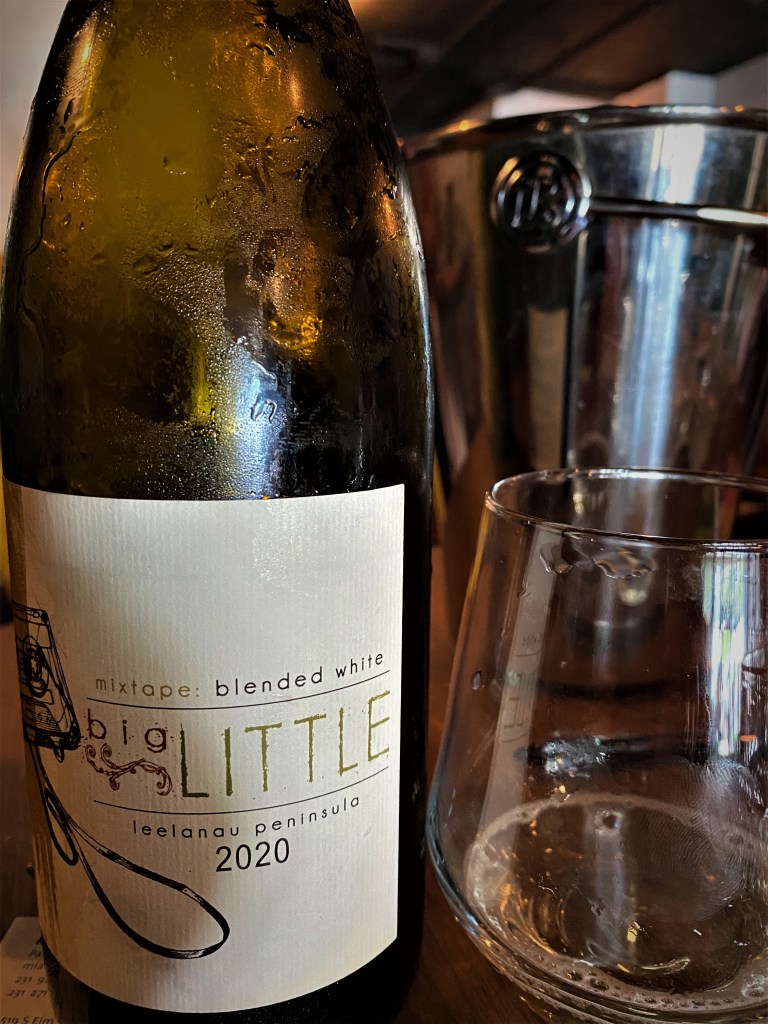 The penultimate wine for the tasting was bigLITTLE Wines “Mixtape” Leelanau Peninsula 2020. One of ways in the old days to make a collection of music that one enjoyed to hear over and over, was to record the music on tape, way back before computers made everything so easy and this was named to honor how this wine was made. This wine is a field blend of grapes that are grown and picked together at their Sylt Road Vineyard. The wine is a blend of Riesling, Gewurztraminer, Pinot Blanc and Pinot Gris. The wine is fermented slow and cold and bottled with residual grape sugars for an off-dry white wine and there were four-hundred cases made of this wine. The pretty soft straw-colored wine offered notes of fresh fruit and on the palate tones of pink grapefruit, with a mix of sweet and tart, and bright acidity; a charming still wine with a touch of sweetness, and refreshing.