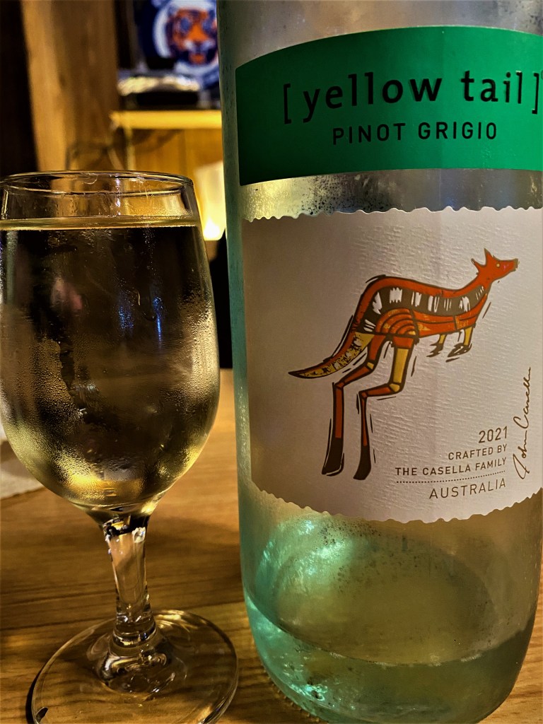 I was attending a reunion of the Shamrocks, the name of my Bride’s high school’s nickname. They were trying to get a group together, and since my Bride is not on social media, I had to request a membership to a closed group, identifying myself as the husband, using my Bride’s maiden name. I was accepted and I had to relay all the information to my Bride about potential dates and locations. It all worked out, in the end, and I bit the bullet and tried a glass of Yellow Tail Pinot Grigio Australia 2021, while my Bride was being a social butterfly and reintroducing herself to some of the people that showed up, as I am sure that no one still looks like a teenager. While I was trying the wine. I also secured a table for five of us to have dinner. My Bride pulled herself a way for a bit, to try the wine, as the restaurant only carried wines by the magnum, or double bottle, and the price of a magnum for any of their wines was the price I have paid for a glass of wine in some locations. I tried the Pinot Grigio, for my Bride and for the record, the wine was a soft yellow, with floral notes, on the palate a bit of fruit (citrus?) and a very short finish of almost rubbing alcohol. It could be, just because the magnum only had perhaps one more glass left, and who knows how long it was between pours; it also didn’t help that the wine glasses were the old-fashioned restaurant utilitarian glass where the wine is filled to the brim.