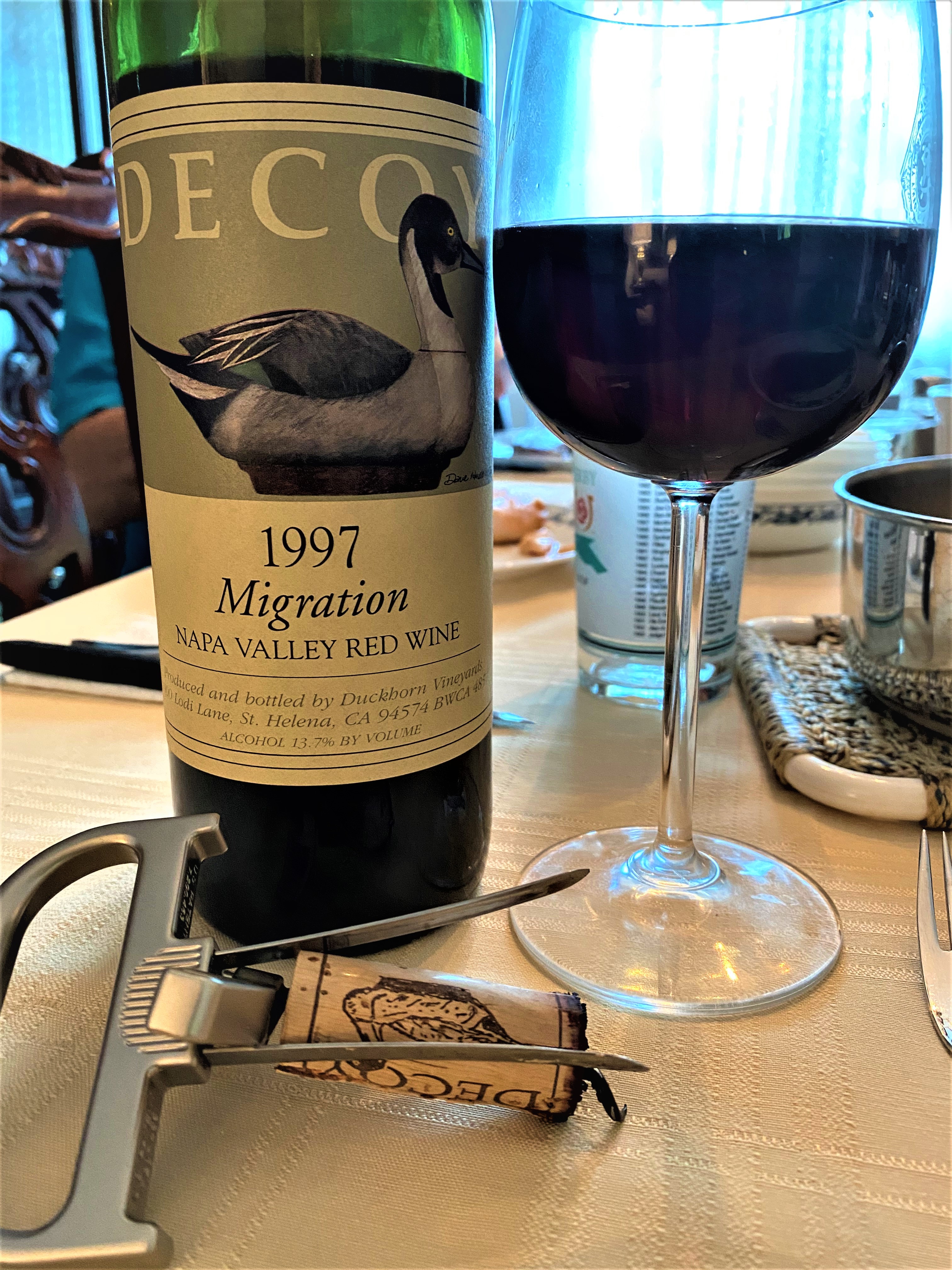 I went into the cellar and grabbed something that I thought was interesting. We had a bottle of Duckhorn Vineyards and Winery Decoy “Migration” Napa Valley Red 1997. We still have some of the wines that we bought from our initial visit to Duckhorn, arranged through a customer of mine, one of the sons (when it was still a family-owned winery) gave us a private tour, and a private tasting in the back of a semi-trailer, as we sat on cases of wine, and on occasion we would have to get up, to open another case to try another wine. Memories like that can’t be duplicated. The wine was a blending of different varieties and different contract and owner properties, back when Duckhorn Vineyards produced all of their wines in Napa Valley, now Duckhorn is one subsidiary and Migration is another subsidiary. The original concept for Migration is that the wine could change from year to year. This wine was produced from fruit harvested from seven different vineyards within the appellation. The wine was fifty-one percent Cabernet Franc, twenty-six percent Merlot, thirteen percent Cabernet Sauvignon and ten percent Petit Verdot. The wine was aged for eighteen months in a blend of sixty percent French Oak (ten percent new, sixty percent second and thirty neutral) and forty percent American Oak (all second use). I had my Durand corkscrew so the cork remained whole. For a twenty-five-year-old the wine was excellent, with a beautiful deep color. The nose was vintage Right Bank, and on the palate the tannins were soft, but it was still a chewy wine with a good long finish; and for some odd reason there was no leftover wine for the next day.