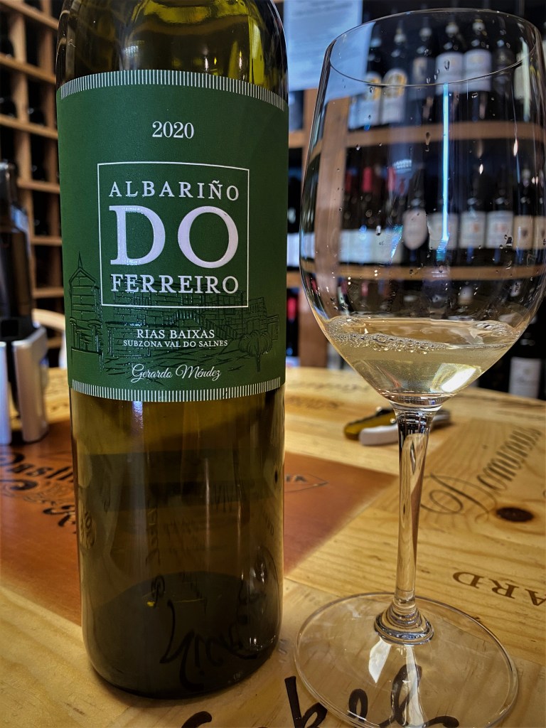 We started with a taste of Bodegas Gerardo Mendez Albarino DO Ferreiro Rias Baixas subzone Val do Salnes 2020. The DO wine zone in the Galicia region of Spain was awarded in 1988, and the predominate grape is Albarino. There are five distinct Subzones and Val do Salnes is considered one of the most important of the subzones and it is known as being the coolest and wettest of the zones off the coastline and a granite soil. The DO rules state that the wine must be seventy percent Albarino, but this particular wine is pure Albarino. Bodegas Gerardo Mendez has vineyards dating back to 1850 and now they are completely modernized. This straw-colored wine offered big floral notes. On the palate a very crisp wine with tones of floral and mouth-watering acidity with a decent finish of minerals, a wine that a lot of people refer to as green and flinty.