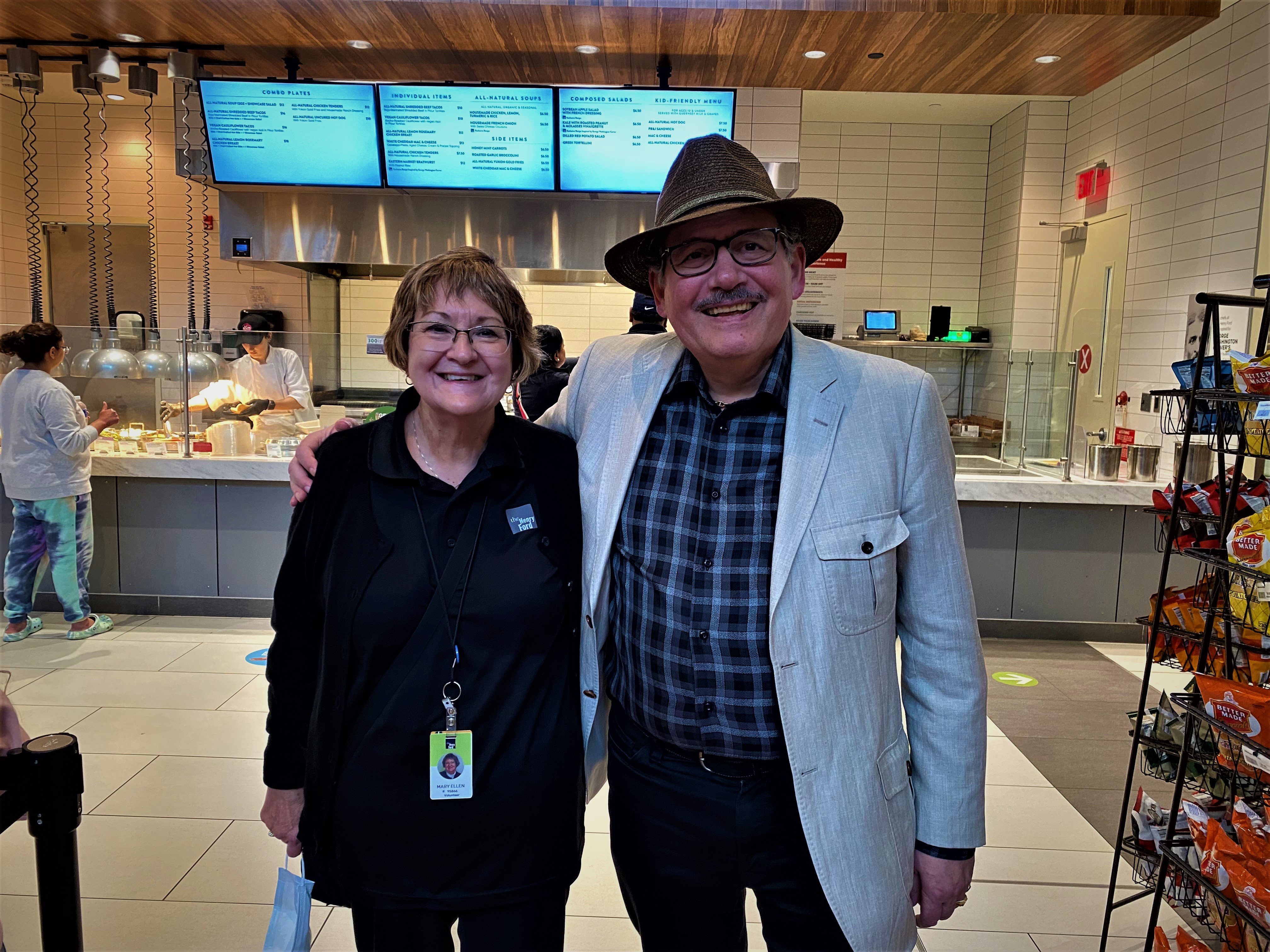 The car was basically one of the first exhibits that we saw, and it was back in the railroad section of the museum.  A lot of men set up model trains in their basement, Henry Ford bought the real things and had rail tracks installed to display them properly.  We walked around and saw most of the exhibits, and my Bride was getting hungry, when we walked over to the new restaurant in the museum, it was slammed, so I suggested that we go and walk around some more, and come back in a little while.  Sure enough, about an hour later, the crowds had disappeared and we basically walked right into to place our food orders.  As we were getting ready to order, a woman asked “will this be in your wine blog?’  I confirmed her question, but I didn’t recognize her, as she was wearing one of those horrible masks that our governor mandated, until she was threatened with an impeachment, then the science requiring the mask disappeared immediately.  The woman in question and I had worked together, she is now retired like I am, and she works a couple of days as a volunteer in whatever capacity that she is needed for that day.  I had my Bride capture the moment.