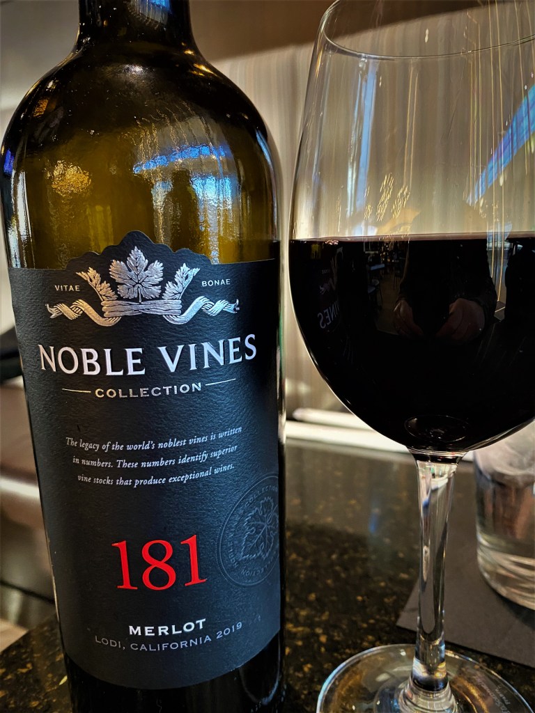 My Bride was not hungry, she just wanted some wine and she figured that she could nibble around my order. I had the Angus Beef Burger with Beer Cheese, Fried Egg, Roasted Tomato, Smoked Bacon and Twice-Cooked Fries, but our waitress touted me to upgrade to the Truffled Fries version. I didn’t want the egg and my Bride asked if the egg could be served on the side, so that and a third of the burger and the majority of the fries fed her quite nicely (and she said that the egg was more poached than fried). I enjoyed Noble Vines Collection 181 Merlot Lodi 2018. Noble Vines is a value wine brand created by Delicato Family Vineyards which has vineyards in the Central Coast region. They are very big in donating to a large group of charities from the proceeds of their sales. The 181 Merlot refers to the Merlot 181 clone that was initially derived from cuttings of plants in Pomerol and is now the largest clone planted in California. I have to admit that I have always been partial to a glass of Merlot, and I am becoming quite fond of wines from Lodi. Lodi has a soil that makes the vines struggle with a “soil” that is stones over red clay. The deep garnet wine offered notes of dark fruits and cloves. On the palate tones of black cherry and black plums with spices and soft tannins leading to a moderate finish of fruit and some terroir. A nice wine for instant gratification without the need to cellar.