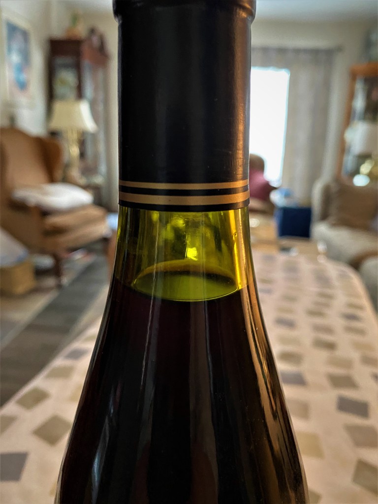 I now look at the liquid in the bottle, after I have pulled it out of the cell that it occupied to see if there has been evaporation. I know that when I am talking about a wine that we are drinking, I claim that the wine evaporates as we are talking with friends or having dinner, especially if it is awesome. Though the evaporation that I am talking about is while the cork and capsule are still fully sealed and there is a gap of air between the wine and the capsule (that piece of metal or nowadays often plastic that goes over the corked-up bottle at the winery) as the wine is filled up past the capsule at the winery. If there is any space of air, that space is called ullage. Ullage is the Anglicized version of the French word ouillage and it has a couple of meanings, both kind of similar in the big picture with wine. To put it in easy-to-understand layman’s terms, it is the amount of air space between the wine in the bottle and the cork that I am going to discuss, the other meaning is for the evaporation of wine in a barrel while it is aging, before bottling and normally the winery “tops” the barrels with additional wine to keep the barrels full, to prevent oxidation. The more air space the better the chance that the wine has met air, as the cork and capsule are not air-tight any more.