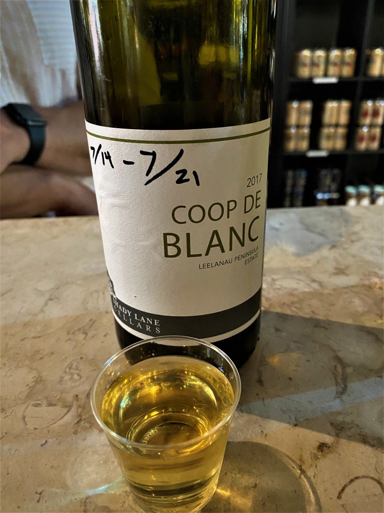 I then tried three wines from Shady Lane Cellars on Leelanau Peninsula, a small, but industrious winery that produces about seven-thousand bottles of wine each year. We have been to the winery in previous trips to the region. The wines I tried were the Coop de Blanc Estate Leelanau Peninsula 2017, the Semi-Dry Riesling Estate Leelanau Peninsula 2019, and the Cabernet Franc Estate Leelanau Peninsula 2018. The estate vineyard was first planted in 1989 and their tasting room opened in 1999 and they are one of the original twelve vineyards on the Leelanau Peninsula. Richard Fortune was originally from Indianapolis, Indiana, but his family had been visiting the region for about fifty years. He built a home and started a vineyard named Hennessey Harbor Vineyards and in 2013 he became the owner of Shady Lane Cellars. Shady Lane Cellars now owns just over sixty acres in two distinct vineyards. The Coop de Blanc is pure Vignoles and the first grape of the harvest. Vignoles is a cold-hardy hybrid bred by J. Ravat in the 1930’s in France, and is basically grown in the northern and midwestern state of America. The parents are thought to be either Pinot Noir or Chardonnay, but it is no longer sanctioned in France, but has found a home here. A pretty golden colored wine that offers notes of tropical fruits, white florals and ginger. On the palate there were tones of pineapple, tangerines, a touch of honey and a tinge of ginger. It has nice acidity, refreshing and bit sweeter than I usually drink, but I found it enjoyable, and I think that I would enjoy it with some fried chicken. I then had the Semi-Dry Riesling made from four different clones and fermented in small batches and aged in Stainless Steel for a bit. The straw-yellow colored wine offered notes of citrus and orange blossoms. On the palette there were tones of green apples and citrus with some bright acidity and crispness. The Cabernet Franc had Initial Fermentation for nineteen days in open-top bins with four different strains of yeast. The Malolactic Fermentation began after the wine was placed in French Oak barrels and were aged for eighteen months. A nice garnet red wine that offered notes of dark fruits, pomegranate, and violets. A pretty wine that offered tones of dark cherries, and baking spices with fine tannins and balance acidity. An enjoyable wine.