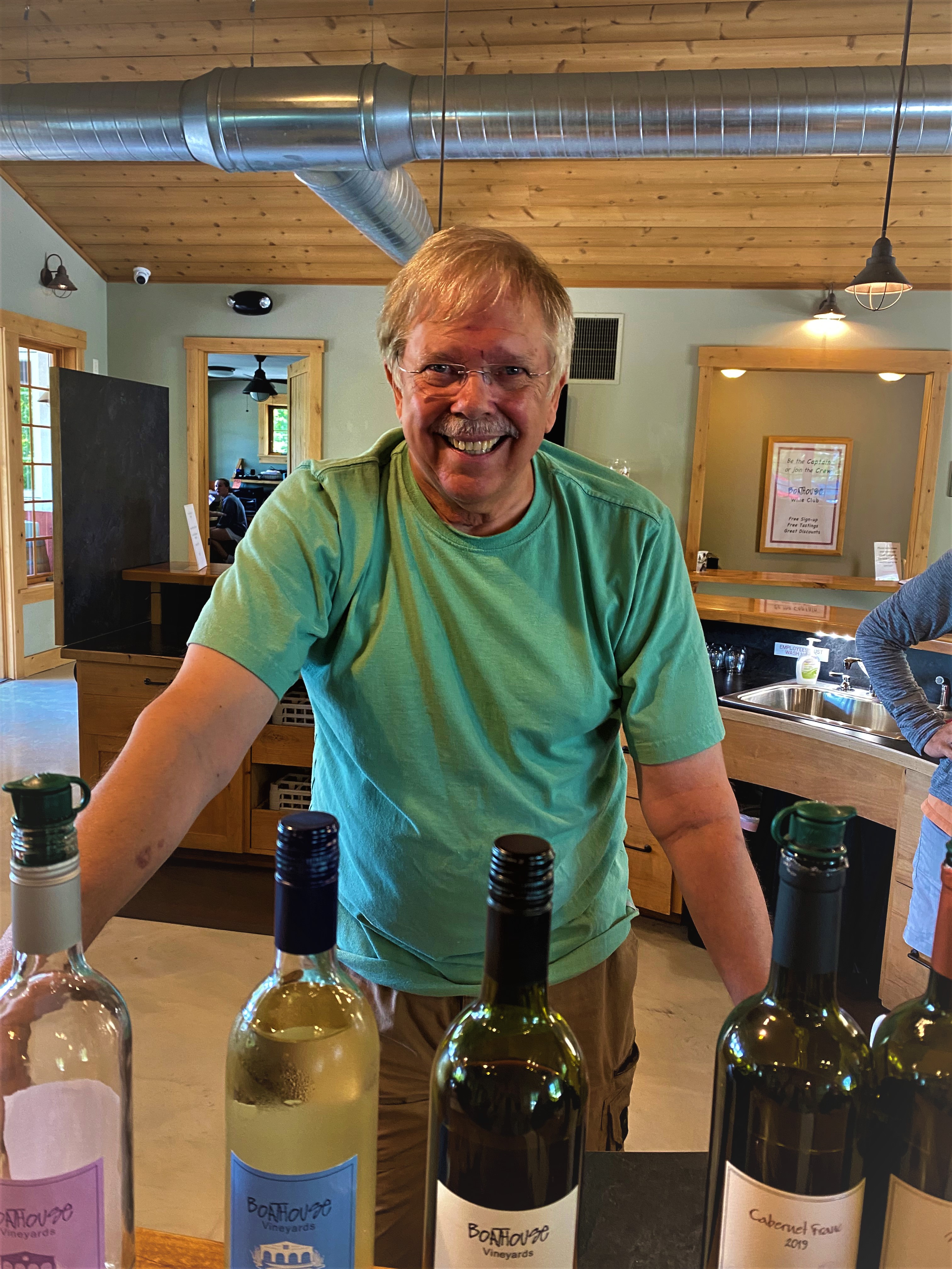 My Bride wanted to make sure that some if not all her sisters had a chance to visit Boathouse Vineyards up in the Leelanau Peninsula.  We had found it during a trip up north in 2017.   This is a winery that can be visited by car or boat, as the tasting room is located on the waterway connecting North Lake Leelanau with South Lake Leelanau. Michigan is the pleasure boat capital of the country with all of its coastal areas and marinas and Boathouse Vineyards has capitalized on this. If you haven’t discovered it by now, I guess I am rather gregarious and when I am at a winery, I like to take notes and my Bride and I were handed over (for the second time) to none other than Dave Albert, an ex-auto guy (go figure in Michigan) who decided to be in the wine business. What a pleasure it was to talk with him again, his passion for what he is attempting is marvelous; and he even remembered us.