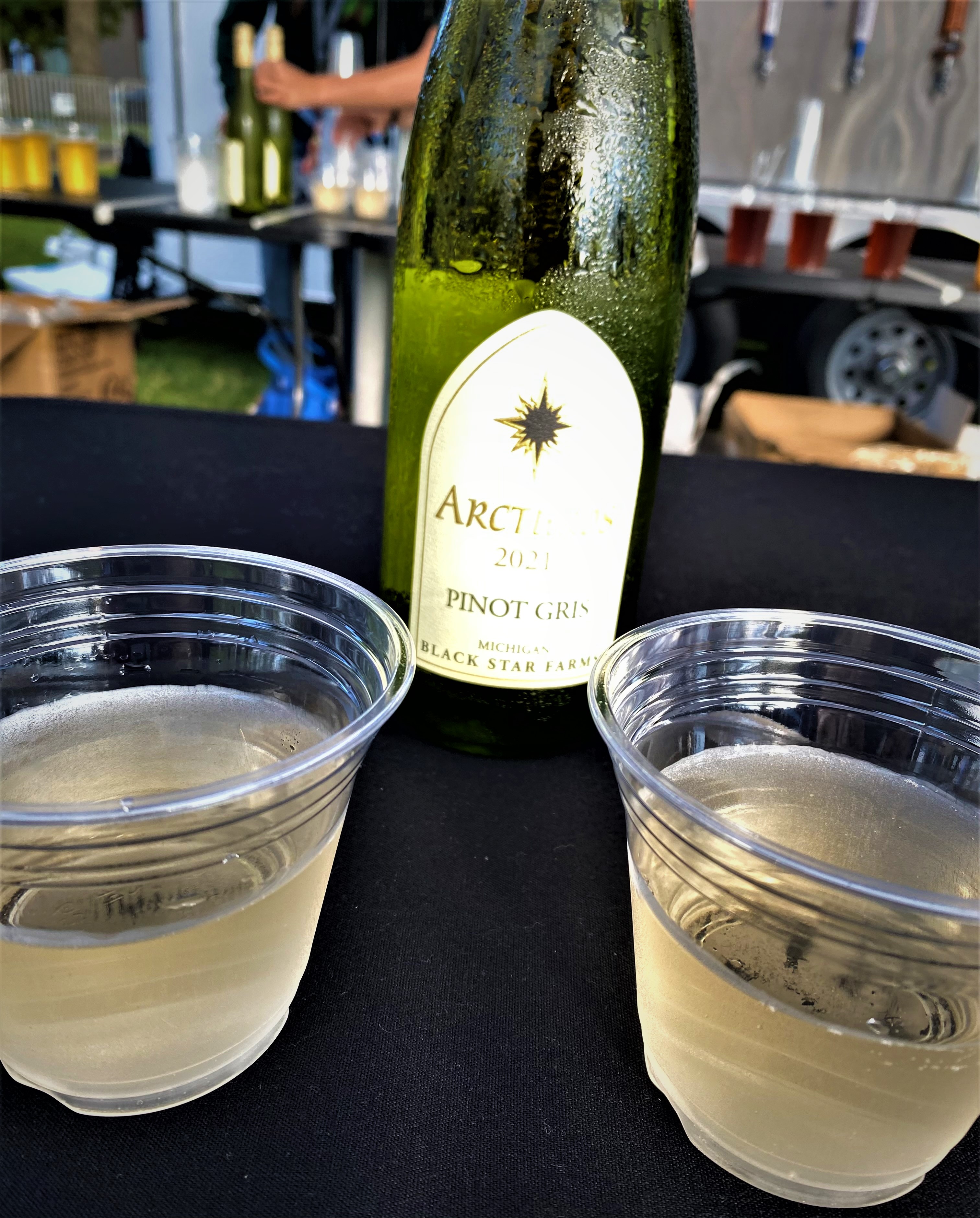 Of course, I have to mention that I went and bought some drink tokens to take back to the seats, and the beer tent and also the wine tent were doing a good business. I noticed that Black Star Farms of Old Mission Peninsula and Leelanau Peninsula was a major contributor and advertiser for the school. Black Star Farms is rather unique in that it has vineyards and tasting room facilities on both peninsulas, so that they are kind of surrounding Traverse City which is kind of the focal point for all of the wineries in the area. In 1998 Black Star Farms purchased Sport Valley Farm which was a one-hundred-twenty-acre equestrian facility, and the stylized black star was part of the architectural décor in the main house. In their Twentieth year, they were honored to receive the 19’th Annual Canberra International Riesling Challenge (CIRC) -Best Wine of the 2018 Challenge and only the second time an American wine came out on top. My Bride and I had a glass of Black Star Farms Arcturos Pinot Gris Michigan 2021. The wine carried a Michigan AVA, because eighty-two percent of the fruit was from Old Mission Peninsula and eighteen percent was from Leelanau Peninsula. The soft straw-yellow colored wine offered notes of citrus and white florals. On the palate there were tones of citrus, and melon, with balance acidity and a medium count finish of fruit and some terroir. The wine, if I had to choose, leaned a bit more Alsatian compared to Northern Italy. The wine was fruit forward, but was still on the dry side.
