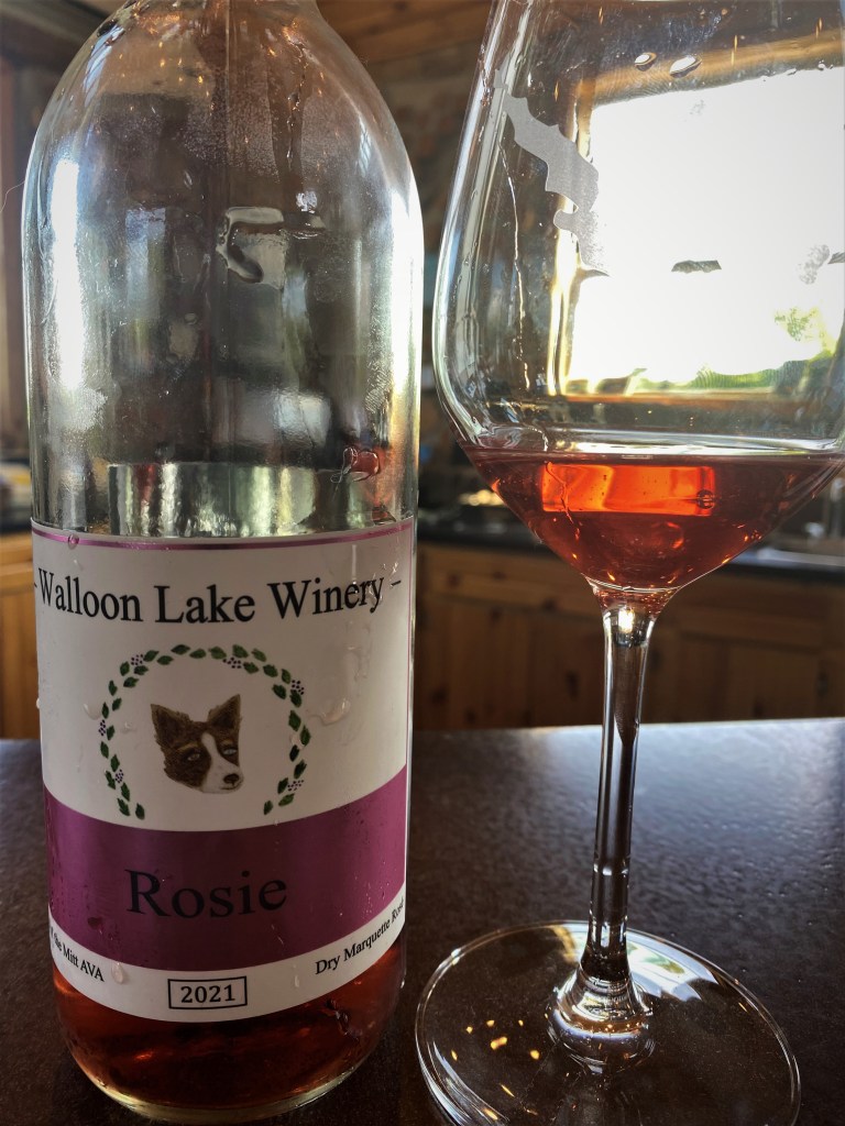 The drive getting there, because of the unexpected detour and the demands for our dinner reservations created a very abbreviated tasting, and I still apologize for it. I did have a chance to try three wines. The first wine was Walloon Lake Winery Sunshine Daydream Tip of the Mitt 2021. A dry blend of Frontenac Blanc and Frontenac Gris fermented on the skins and aged on spent yeast cells. Frontenac Blanc is a genetic variant of the red Frontenac grape and was released in 2012. Frontenac Gris is a pink-berried mutation of Frontenac and was released in 2003. The wine was produced using a “low intervention style.” This coppery-rose colored wine offered notes of tropical fruits and bit of foxiness. On the palate tones of citrus and tropical fruits with an acidity and a short finish “dryness” which I how I would term it. The second wine was Walloon Lake Winery Rosie Rosé Tip of the Mitt 2020. This wine is a dry Marquette rosé wine and named after the winery’s mascot Rosie, a Mini-Aussie. Marquette is a cousin of Frontenac and a grandson of Pinot Noir and is a French-American hybrid introduced in 2006. This pink-hued wine offered notes of tropical fruit and florals. On the palate there were notes of cherry, black fruit, tropical fruit, and a tinge of pepper. The last wine that I tried as my Bride had by then started paging me and honking from the parking lot was Walloon Lake Winery North Arm Noir Michigan 2021. This was a dry Marquette wine that was ruby-red in color and offered notes of dark fruits, tobacco, and pepper. On the palate this wine had tones of cherry, currants, and pepper with suggestions of oak. We will have to try to get back there and try the wines in a more leisurely pace.