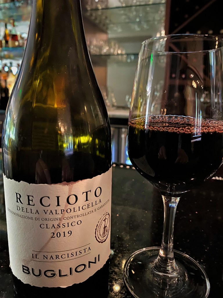 We eventually got to the restaurant Arta’s Italian in Brighton, Michigan, one of our favorite haunts these days. My Bride’s girlfriend who lives in Brighton never ate there, so it was our job to introduce her. We got there a little early, the restaurant wasn’t open yet, but the bar was. The ladies had Negroni’s and I spotted something very interesting on one of the shelves on the back of the bar. I had a glass of wine that is both enjoyed as an aperitif or as a dessert wine. I was enjoying a glass of Cantina Buglioni “Il Narcicista” Recioto della Valpolicella Classico 2019. Cantina Buglioni is an Italian estate in the Veneto, and was founded in 1993 with three hectares, today it has one-hundred-fourteen hectares of vineyards. They produce all the classic wines associated with Valpolicella along with several Spumante Brut wines, a Bianco delle Venezie and a Grappa di Recioto della Valpolicella on their gravel-rich alluvial soils. Recioto della Valpolicella Classico is a sweet version of the famed Amarone della Valpolicella. The technique to produce the Amarone and the Recioto is take whole bunches of the grapes and then keep them in drying rooms, for about three months, with warm temperatures and low humidity, which concentrates the natural sugars and aromatics in their wines. The wine is a blend of sixty percent Corvina, Twenty percent Corvinone, ten percent Rondinella and ten percent Croatina, all grown from their Sant’Ambrogio Vineyard with fifteen-year-old vines). With hand-harvesting at the end of September, Initial Fermentation occurring in February (after the drying period), maceration occurring for about twenty days with skin contact, then Malolactic Fermentation. The wine is aged for twelve months in the Slavonian Oak, then an additional six months in Stainless-Steel tanks, and then an additional six months in the bottle maturing, before being released. A dark ruby-red colored wine that offered notes of black cherries, plums and raisins stewed in alcohol, with secondary notes of cocoa, vanilla, and tobacco. On the palate, a velvety and round blend of black fruits, jam, figs, licorice, dry tannins, and a trace of hazelnuts. It was a perfect way to start the dinner off.