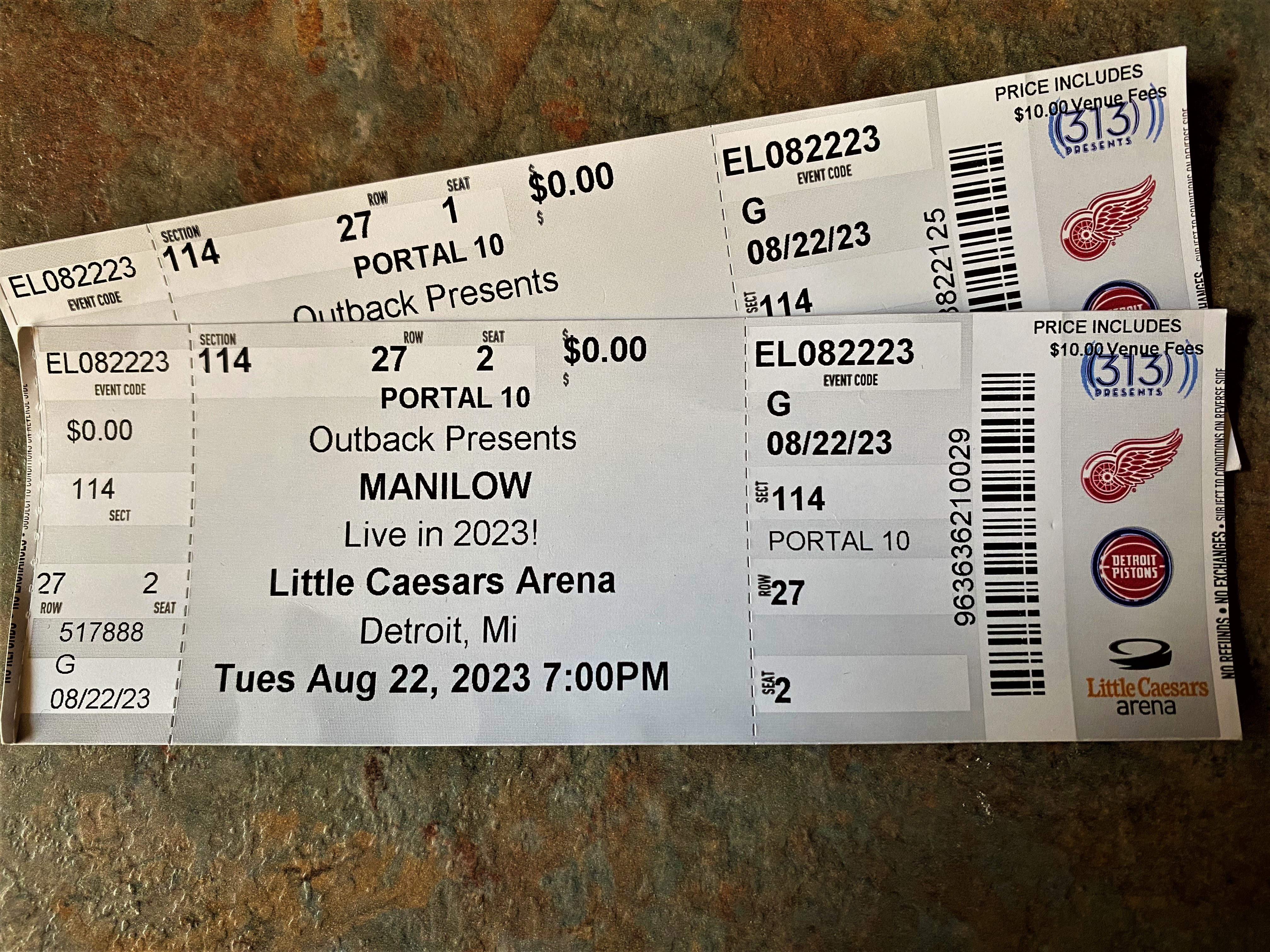 Neither my Bride, nor myself had been to the Little Caesars Arena, which is relatively new for Detroit, but then we are not really sports enthusiasts. We couldn’t find any wine, while we were wandering around the stadium in search for a t-shirt of this event for one of our grandchildren. I didn’t find any wine beyond what we had at the other stadium, and we weren’t in the mood for bulk wine. We decided to have Margaritas, another mistake, I am not sure what the “bartender” made, be neither of us could decide what the drink was. We ended up with a t-shirt and the two “drinks” and discovered that seats that we had paid such a premium for, were way on the side of the stage and in the nose bleed section. Just after, we had gotten comfortable, an usher scaled up the stairs to where we were, and asked if we would be interested in a complimentary upgrade to floor level seats, we graciously accepted them, and we ended up eye level with the stage and just slightly off from the center. A perfect location to enjoy the concert, unfortunately I didn’t like any photo I took at the concert, so I am enclosing the upgraded tickets instead, not nearly as exciting, but I hope you can appreciate the effort.