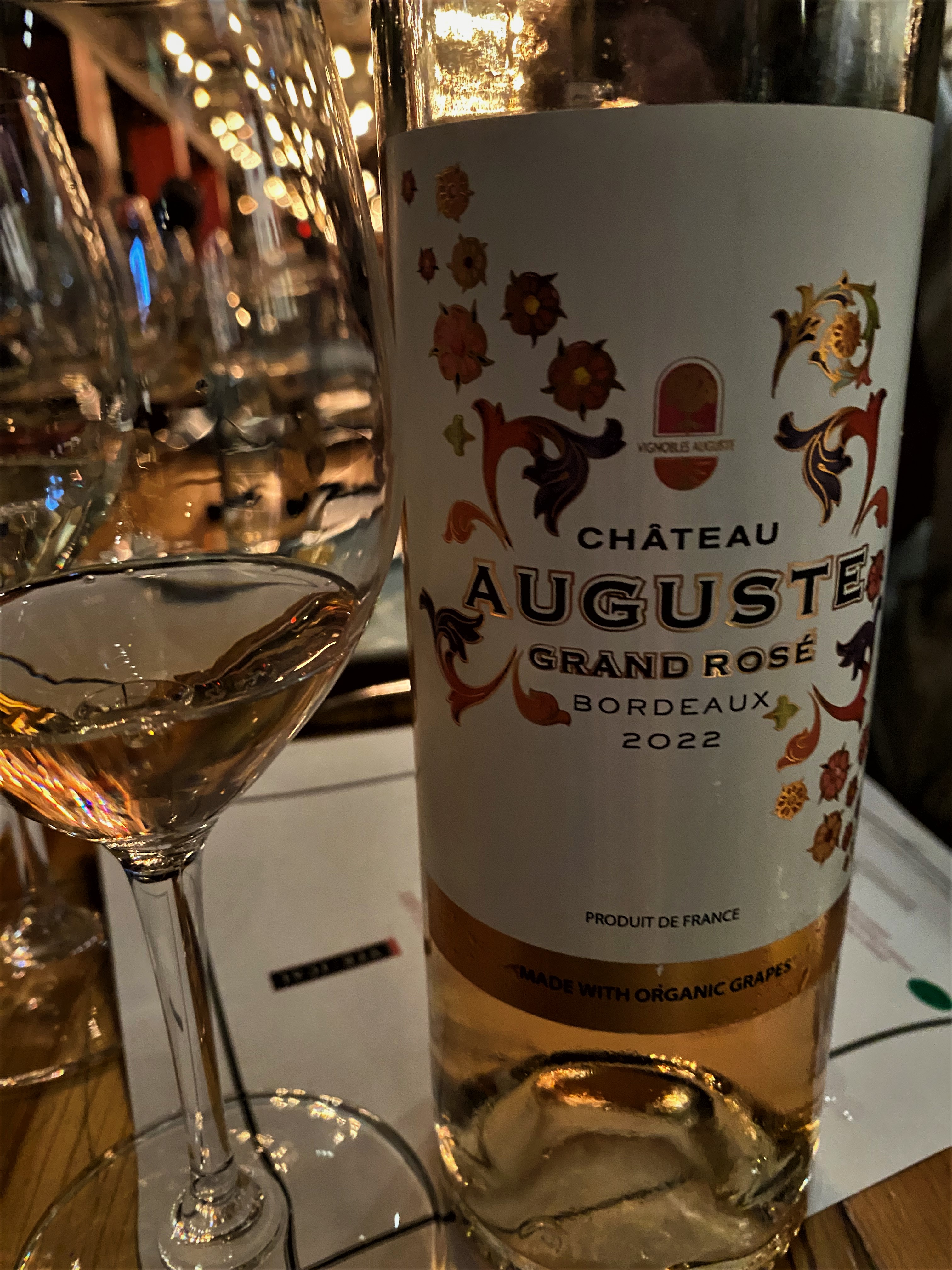The second wine that was poured during the first course was Chateau Auguste Grand Rosé Bordeaux 2022. Chateau Auguste, besides being proud that they are an organic winery, they are also proud that they produce fine quality wines at an affordable price. They also enjoy being out among the vines, as they employ a concept called “Genodics” where they play music or various sound waves and frequencies, twice a day, to stimulate the vines. The wine is a blend of sixty percent Merlot and forty percent Cabernet Sauvignon. A pretty coppery-rose colored wine that offered notes of watermelon and strawberries. On the palate this wine evoked Provence with its freshness and offered tones of strawberries, raspberries and soft tannins and ended with a charming finish requiring another taste.