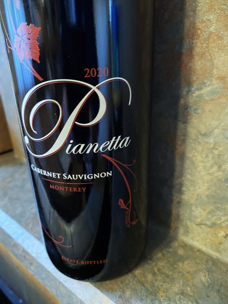 The first wine from the carton was Pianetta Winery and Vineyard Cabernet Sauvignon Monterey 2020. It is located north of Paso Robles in the hills of Indian Valley. John Pianetta planted his sixty-five acre estate in 1997 of Cabernet Sauvignon and Syrah, and now the estate offers Cabernet Sauvignon, Petite Sirah, and Petite Verdot. On terraced slopes, the fruit is hand-harvested and aged in oak. The wine is described as having bright fruit with raspberry on the nose, bold and velvety with hints of anise, currants, and balance acidity.