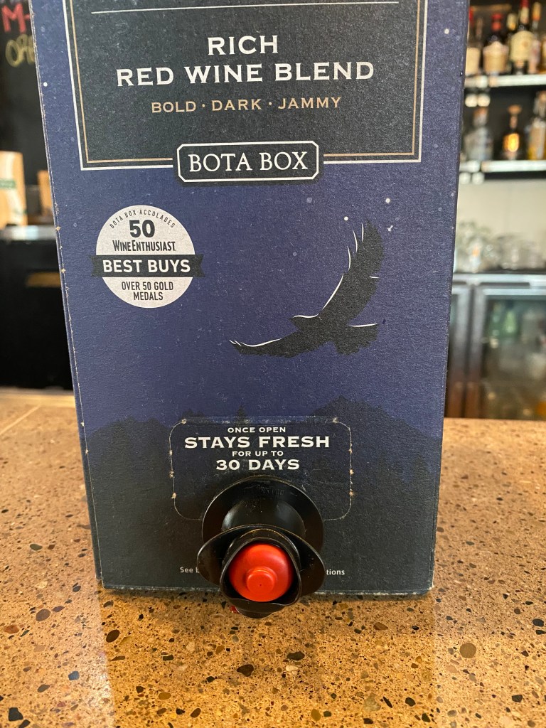 Little did I know, that my Bride decided to have a group dinner with some of her friends and suggested Republica, even though we had not eaten there yet, and we were going on my “say-so.” One of the other spouses enjoys playing Devil’s Advocate and always finds ways to disagree with me, and frankly I had no desire to go, but the wrath of my Bride would be worse than someone at the other end of the table. My Bride had the Lexi’s Loaded Caesar with avocado, Parmesan, bacon, tomato, croutons with a Lemony Caesar Dressing topped with Salmon. I was there for the ribs and they were based on a famous “rib-house” back in the day, so I had the Mitch’s Famous Ribs with Fries and a side order of Onion Rings. I mean go big or don’t go; but I did miss not having some creamy Cole Slaw. I will definitely go back there again for the ribs, and my Bride enjoyed her non-classic salad. We were getting a bottle of wine, and we shared a glass with wife of the “advocate” and they had a glass of Bota Box Nighthawk Black Rich Red Wine California NV, the red house wine and owned by Delicato Family Vineyards. It was a wine that came in a three-liter plastic bladder with a tap, nestled in cardboard box. I could not find any information about the Rich Red Wine varietals. Though the wine was written up by the winery on a page as “California-Rich aromas of raspberry, blackberry, caramel, and hints of vanilla. Extending into lush flavors of fig jam, dark chocolate, toasted marshmallow, and baking spice, this smooth full-bodied wine culminates into a juicy, lingering finish.”