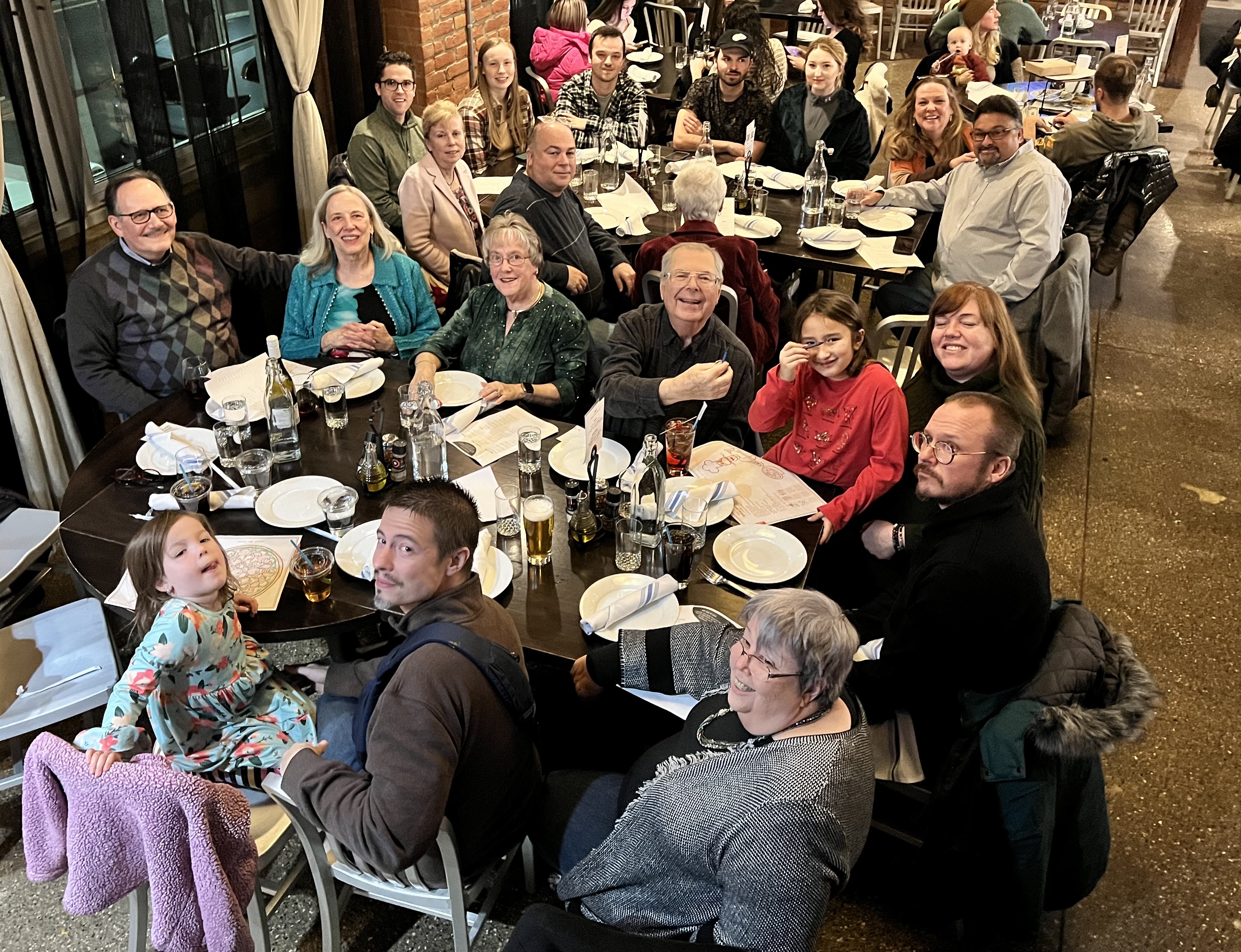 We all decided to get together for dinner at Bigalora Cucina in Royal Oak. The crowd has met at several of the different locations of this local pizzeria chain over the years, because they can accommodate our crowd. I think that we had twenty-two show up, which is a great showing. Two were AWOL who went to see the Michigan State football game (alumni and son). Also, two spouses of the next generation skipped the festivities as well. I think that the restaurant had hoped that we would take over the second-floor loft, but the steps were too difficult for a couple of our crowd. This chain and a couple of other restaurants are owned and managed by a talented chef, that my Bride and I discovered when we first got married, as his first place was near our home. We basically ate there every Saturday night, as our date night, with the same table and the same waiter. We still continue going to his other restaurants as well, but they are a bit more dear, compared to the original venue, but life goes on.