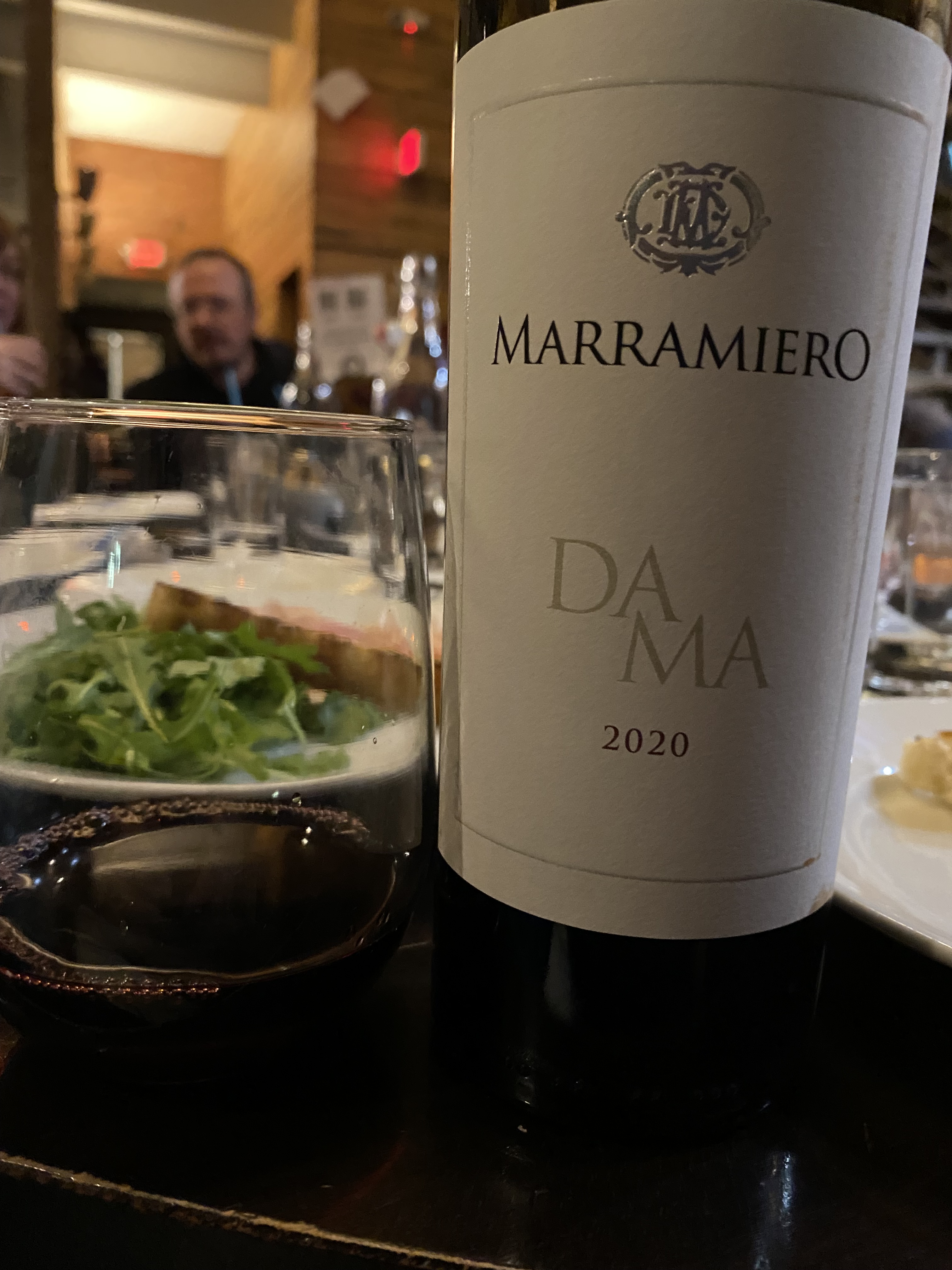 As we were looking at the menu, my Bride heard that they had a Butternut Squash soup, so that was how she wanted to start off. I got us a plate of Prosciutto di Parma, Grana Padana, arugula, and Focaccia bread, that we shared. We then shared a Pepperoni Pizza with House-blend Mozzarella, House-made tomato sauce and Oregano. There was no “doggie bag” for us. As we were getting closer to food time, I switched the wine over to something Italian. We had a bottle of Marramiero Dama Montepulciano d’Abruzzo DOC 2020. The winery was begun by Dante Marramiero in the early 20th Century and followed by his son Enrico on land from Gran Sasso through the hills of Rosciano to the sea planted with vineyards and olive groves. The wine is pure Montepulciano, basically from the Rosciano vineyards which are deep, rich, and basically clay. The first year of production for this wine was in 1994. Fermentation begins in Stainless Steel vats with a long maceration, the wine goes from Stainless Steel to barriques an then in bottle for a total of eighteen months of aging before being released. A deep purple wine that offers notes of black fruit, spices, and licorice. On the palate there were tones of black cherry, oak, soft tannins, and plenty of spiciness with a decent finish of fruit and some leather.